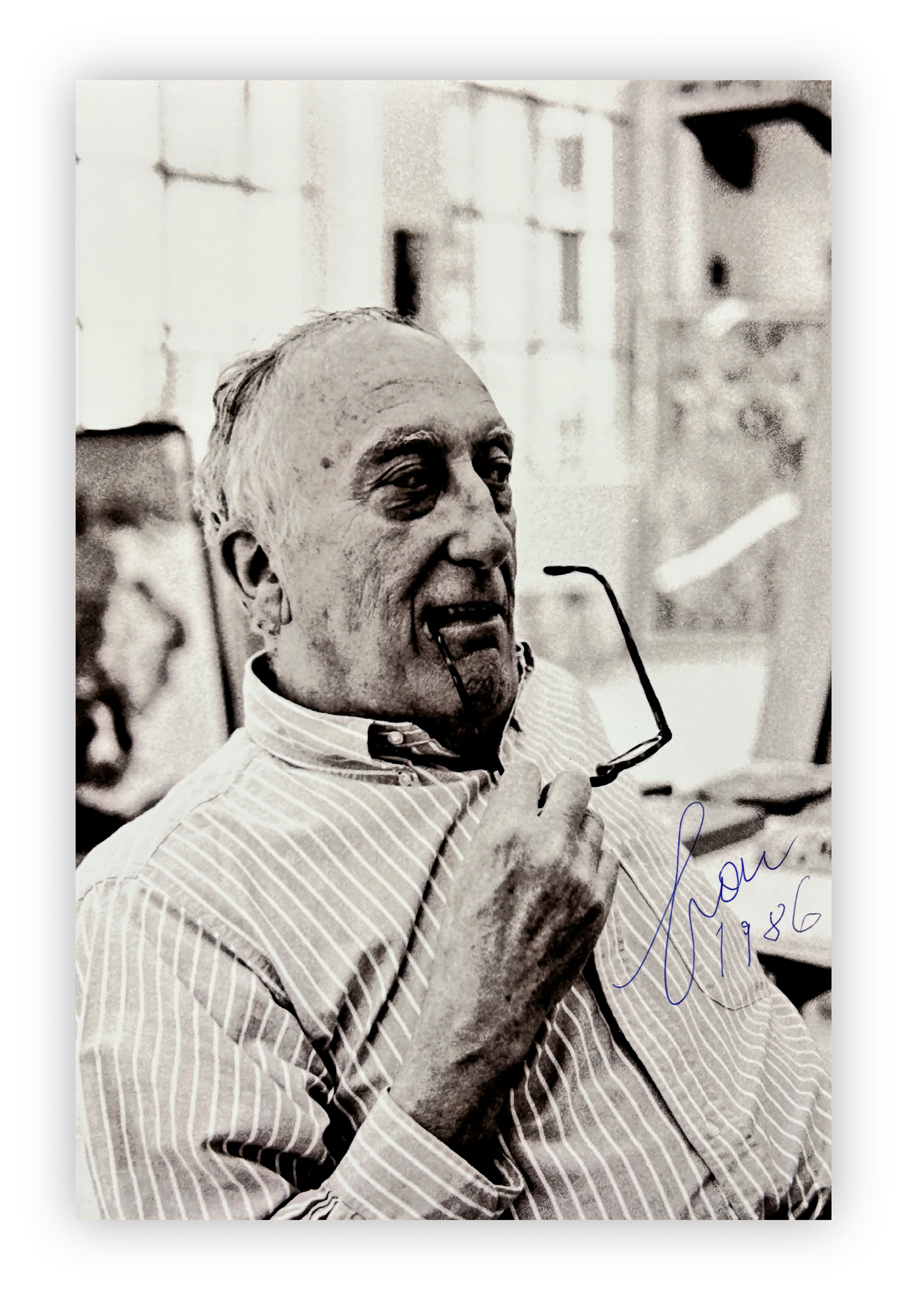 Fotografia in bianco e nero ritraente l'artista Enrico Baj