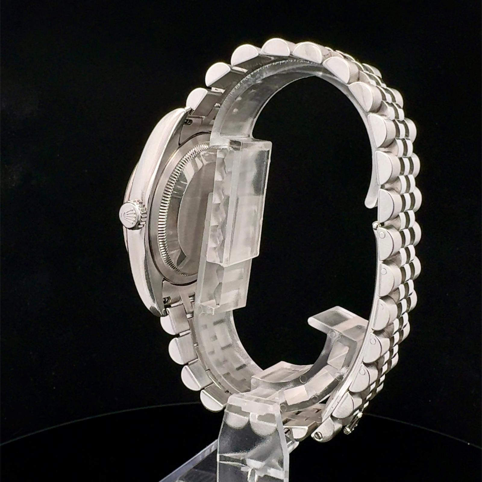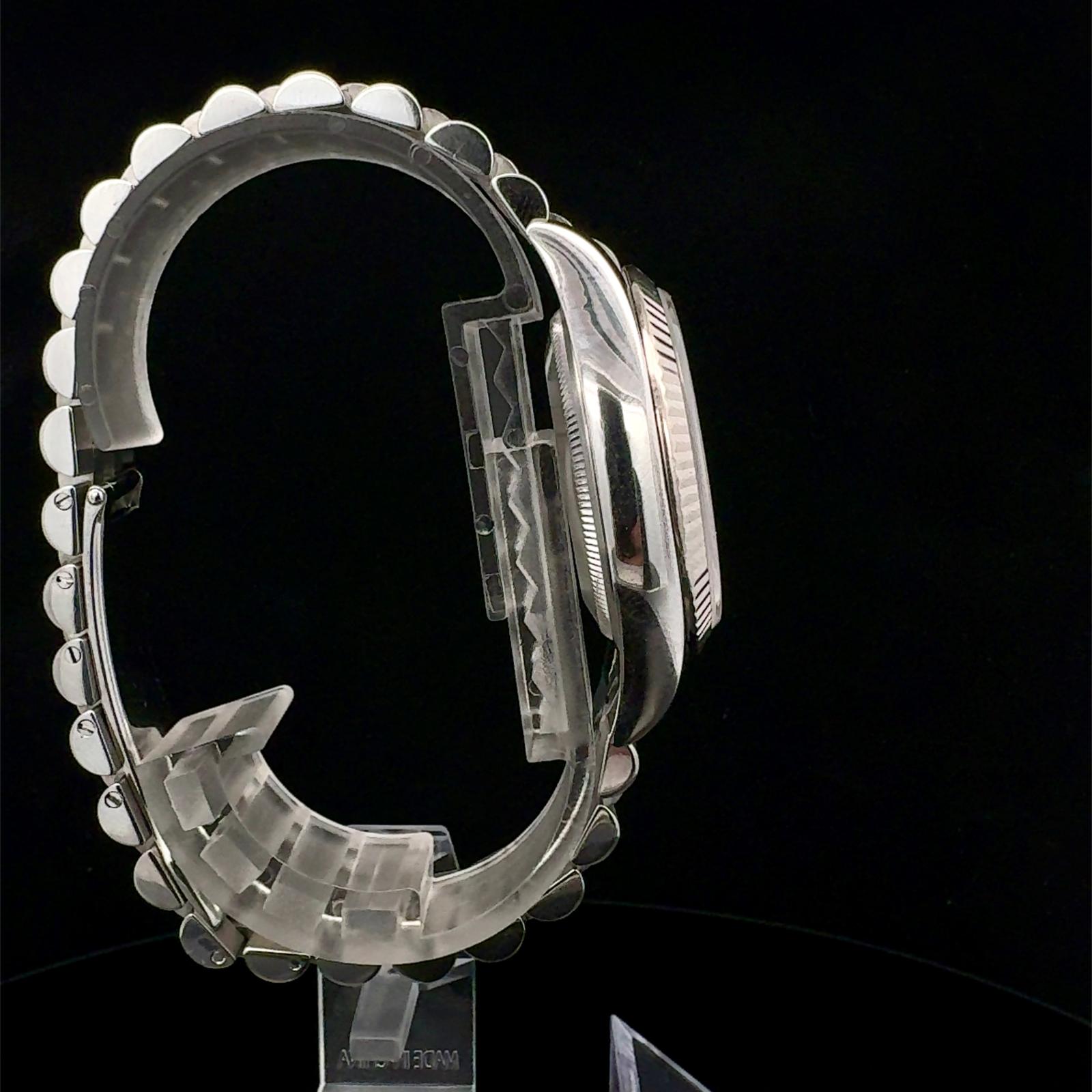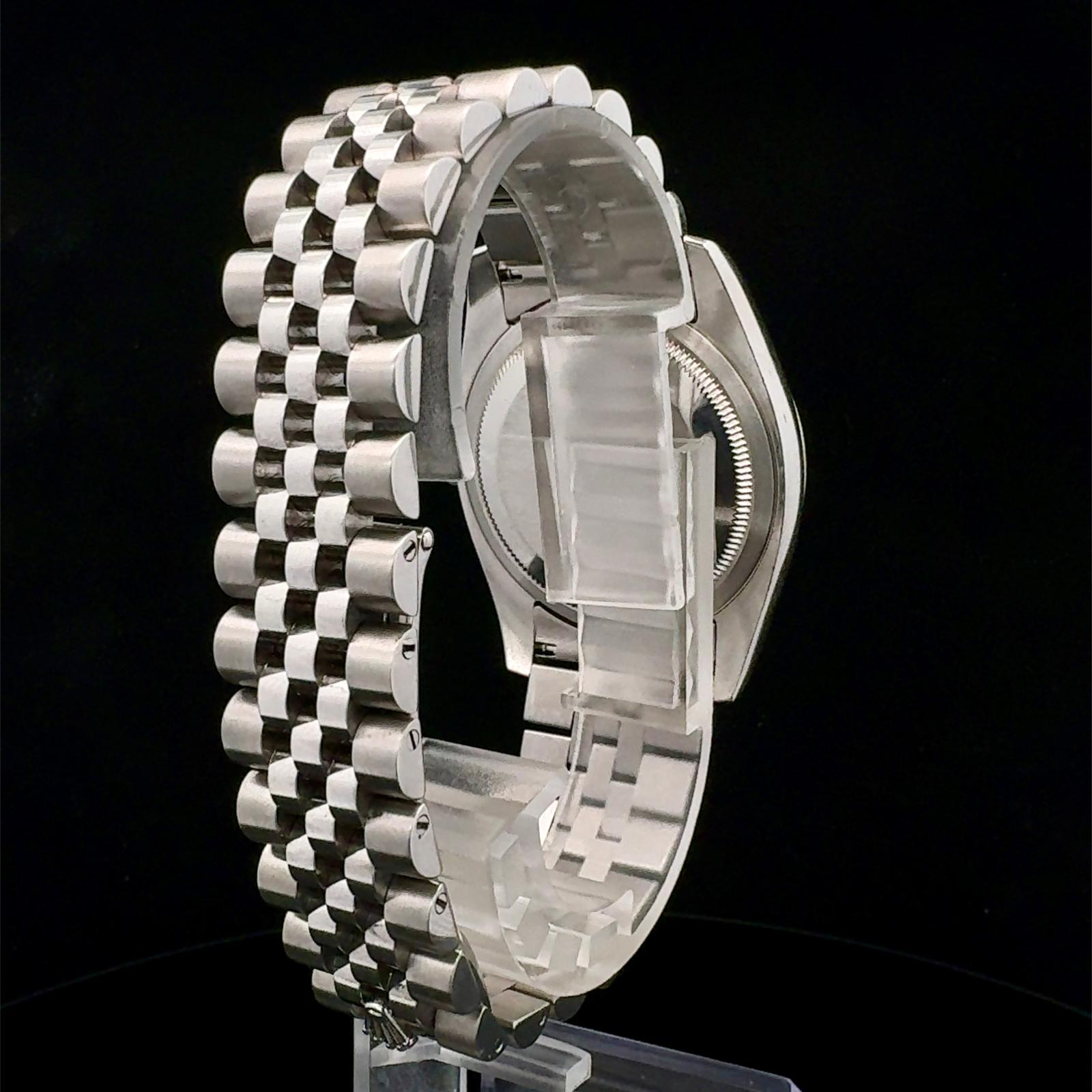 Marca Rolex Modello (Orologio) Datejust 36 Numero di referenza 116234 Carica Automatico Materiale della cassa Acciaio Materiale cinturino Acciaio Anno di produzione 2013 Condizione Ottimo (di seconda mano, segni di usura assenti o appena visibili) Corredo Con scatola originale e documenti originali Calibro Carica Automatico Cassa Materiale della cassa Acciaio Diametro 36 mm Impermeabile 10 ATM Materiale lunetta Oro bianco Vetro Vetro zaffiro Quadrante Nero roulette Cinturino Materiale cinturino Acciaio Colore cinturino Acciaio Chiusura Déployante Materiale chiusura Acciaio Funzioni Data