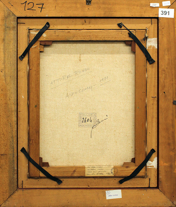 ALDO CIUCCI, "Attore rosso", 1971, olio su tela, dim 50x40. Al fronte: firma in basso a sinistra. Al verso: al centro titolo, firma e anno, timbro della Galleria Accademia Italia di Torino con firma, in basso etichetta Galleria Accademia di Torino con autore, anno, titolo, dimensioni, tecnica e timbro Galleria. Opera con cornice.