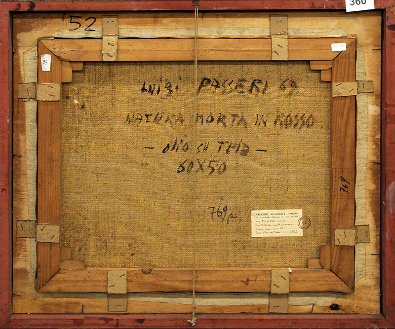 LUIGI PASSERI, "Natura morta in rosso", 1969, olio su tela, dim 50x60 cm. Al fronte: firma e anno in basso a destra. Al verso: firma, titolo, anno, tecnica, dimensioni ed etichetta Galleria Accademia di Torino con informazioni e loro timbro in basso a destra. Opera con cornice.