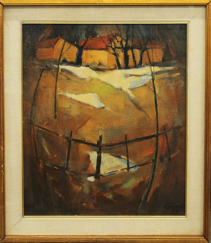 LUCIANO RICHIARDI, "Ultima Neve", 1971, olio su tavola, dim 65x55 cm. Al fronte: firma e anno in basso a destra. Al verso: firma, tecnica, anno, dimensioni, titolo, timbro Galleria Accademia, in basso a destra etichetta della Galleria Accademia con informazioni. Opera con cornice.