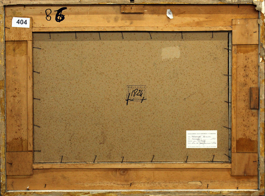 FERNANDO BIGONI, "Paesaggio", 1958, olio su cartoncino, dim 40x59 cm. Al fronte: firma e anno in basso a destra. Al verso: al centro timbro della Galleria Accademia e in basso a destra etichetta della Galleria Accademia con informazioni. Opera con cornice.