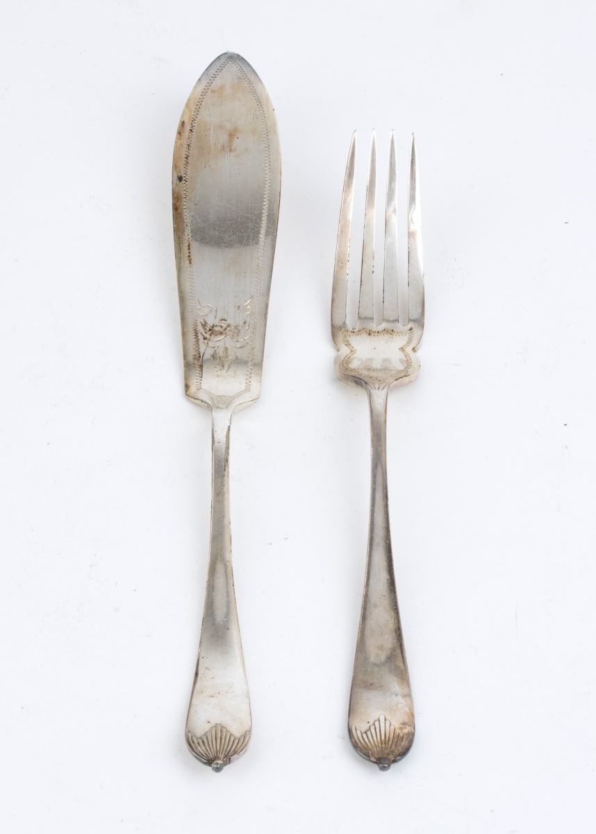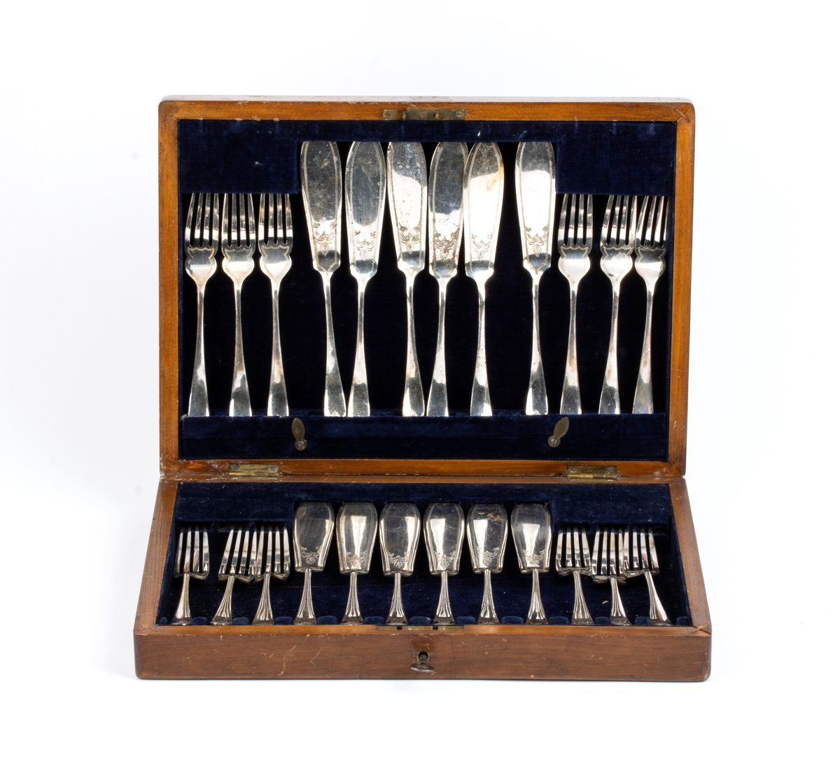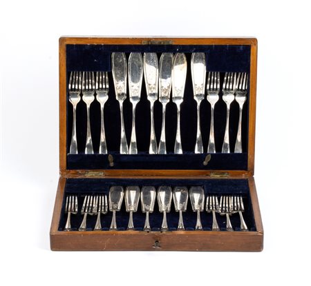 in metallo argentato per pesce con scatola originale in legno. Totale pezzi 24.