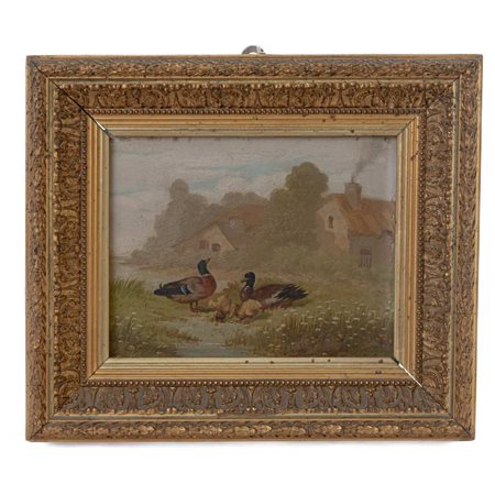 Scorcio di campagna con papere fine XIX secolo dipinto ad olio su tavola 18,5 x 24 cm