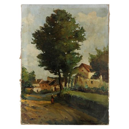 Paesaggio con case e viandante inizi XX secolo dipinto ad olio su tela 55 x 41,5 cm