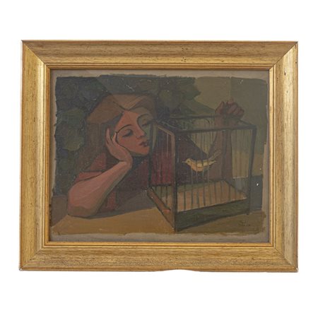 GIUSEPPE PIPPI ( Starace) (Lecce, 01/11/1904 - Roma, 18/01/1977) Il canarino dipinto ad olio su tavola 37 x 47 cm