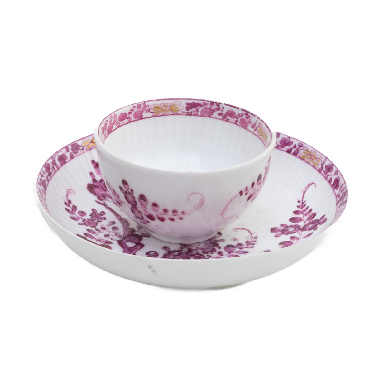 di forma a campana con decoro floreale in porpora di Cassio su fondo bianco. Piatto en suite, finiture in oro zecchino.