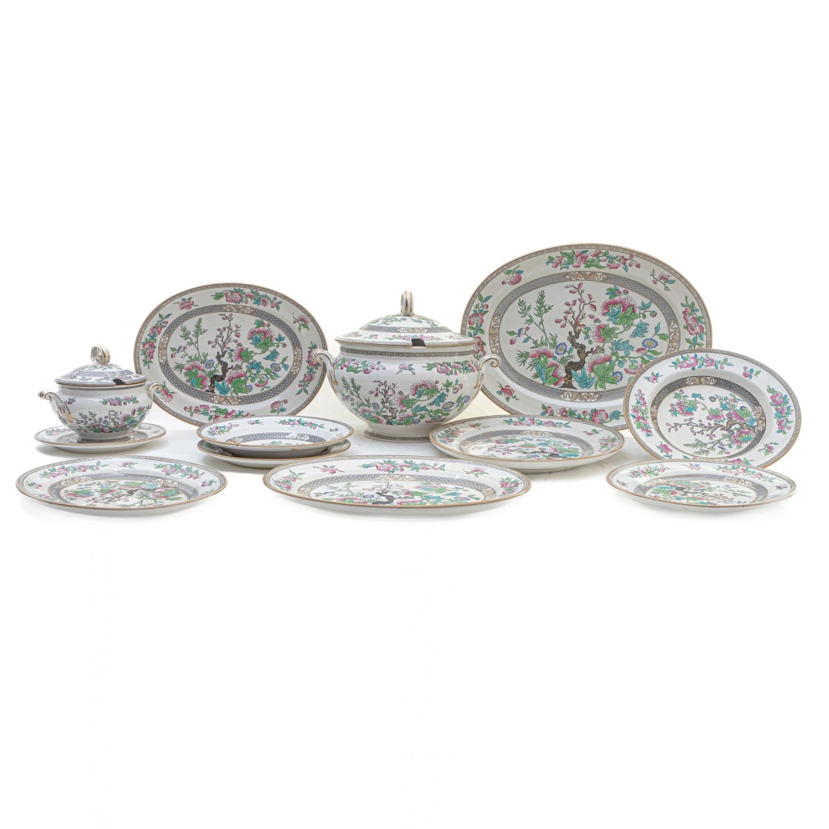 con decoro floreale e finiture in oro zecchino composto da: 12 scodelle fonde diametro 26,5 cm, 14 scodelle piane diametro 26 cm, 12 scodelle fonde diametro 23 cm, 13 scodelle piane diametro 22,5 cm, 12 piatti da dessert diametro 20 cm, 1 zuppiera grande, 1 salsiera, 1 terrina con coperchio, 6 piatti ovali da portata di diverse grandezze e 2 copri vivande pz. 74. Manifatture Minton's Inghilterra.