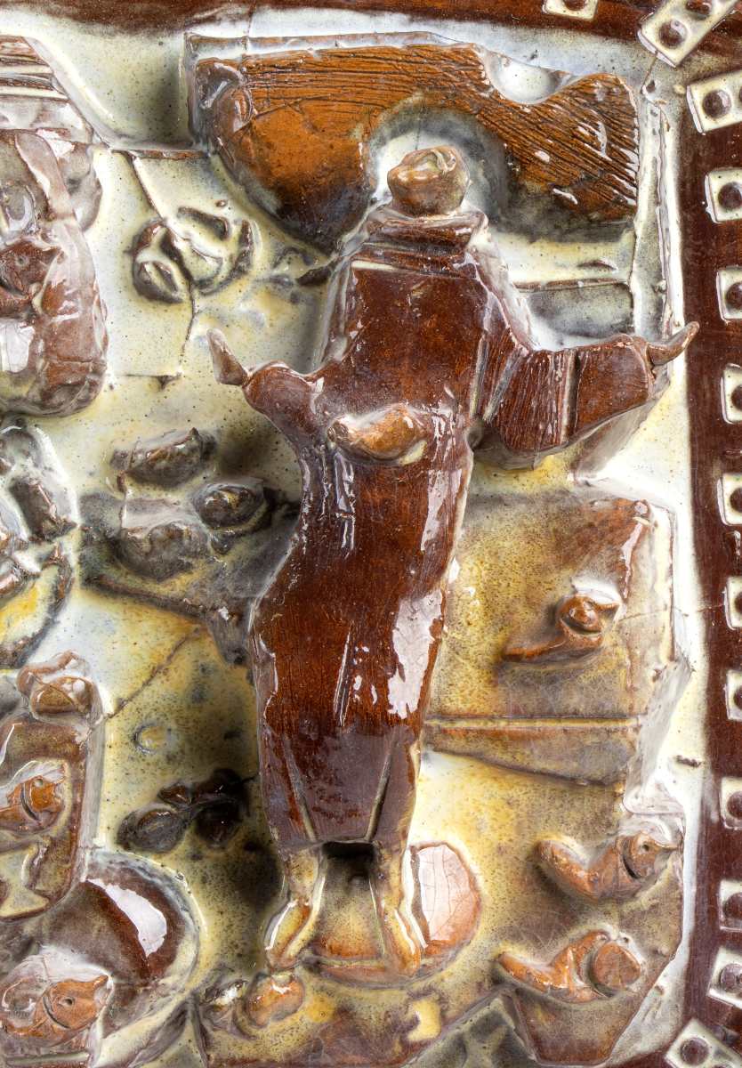 ANGELO BIANCINI (Castel Bolognese, 1911 - 1988) San Francesco parla agli uccelli, Faenza Seconda metà XX secolo Ceramica policroma 32 x 41 x 6 cm