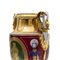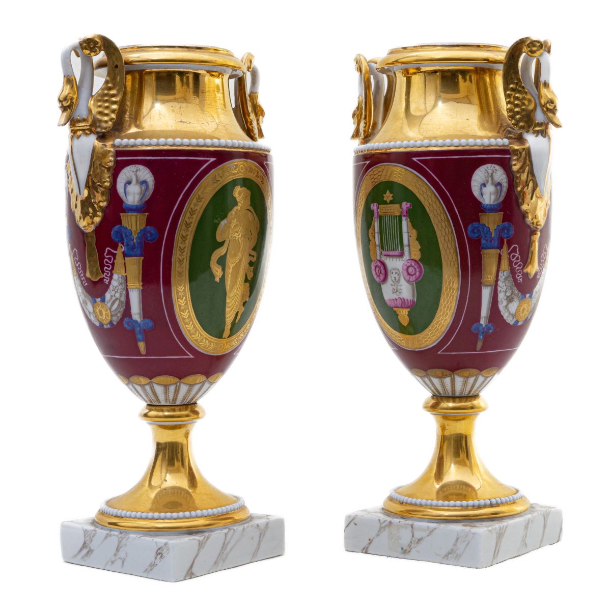 26 x 8 x 8 cm corpo ad urna terminante dal piede tondo perlinato su base quadrata. Collo ad imbuto con coppia di prese a cigno. Decorazioni a riserve su fondo rosso con profili mulieri e festoni di frutta. Collo, piede a finiture in oro zecchino.
