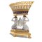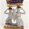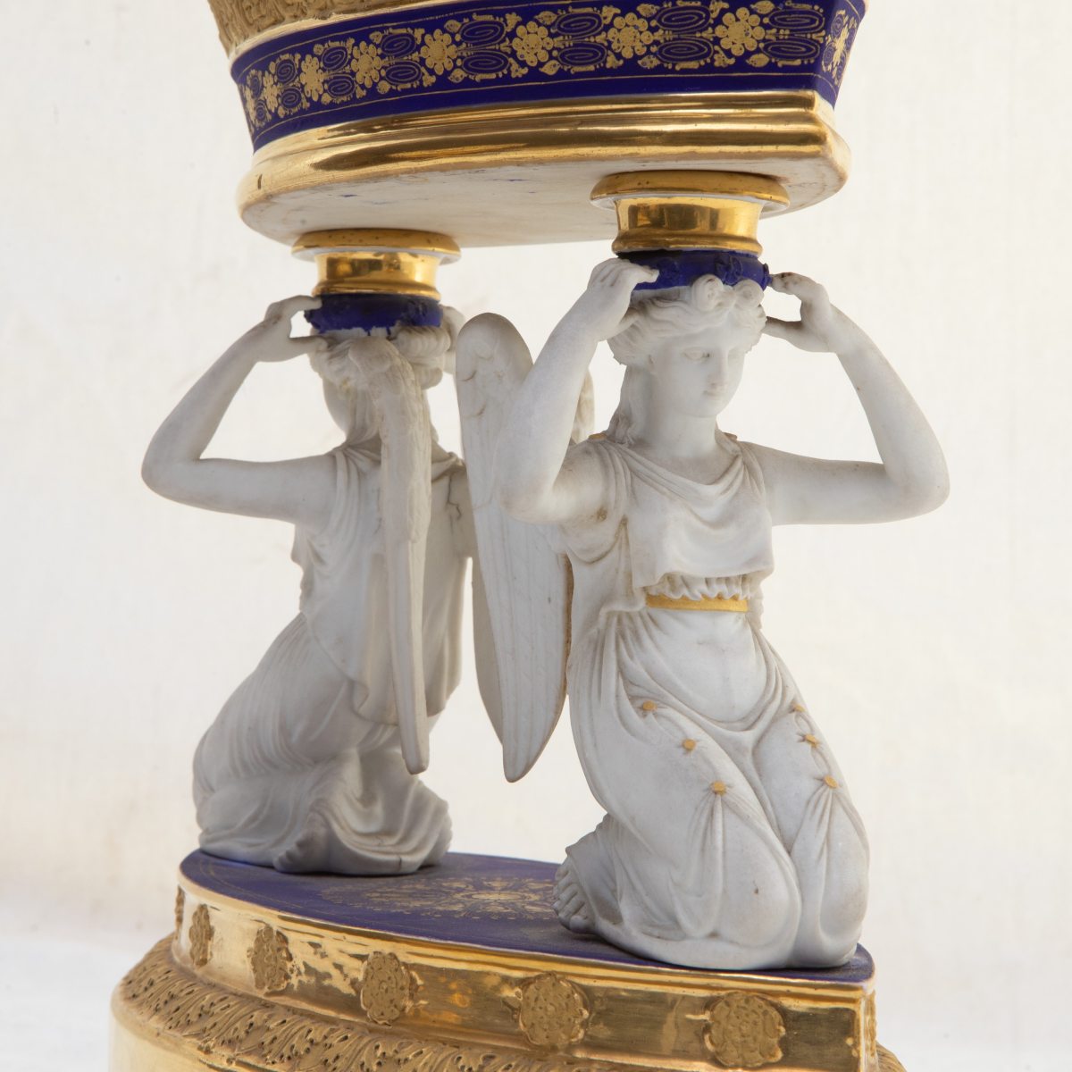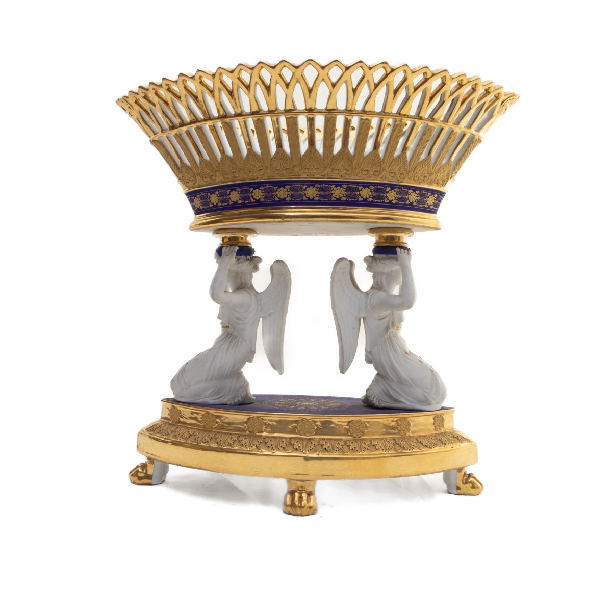 a forma di canestro traforato che poggia su coppia di angeli in bisquit . Angeli poggianti su base ovale a gradoni con quattro piedi di appoggio ferini. Decoro in oro zecchino e blu di cobalto alla base e nel canestro, angeli in monocromo . Finiture con fasce ad elementi floreali a rilievo.