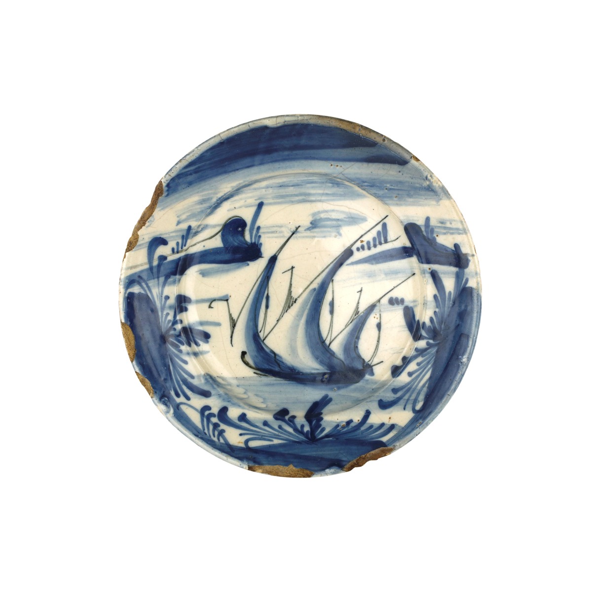 al retro fondo ad anello, nel cavo al fronte paesaggio marino e barca. Al verso in blu sottosmalto marca della manifattura , Spagna Talavera della Reina.