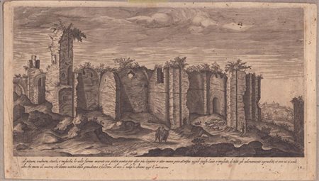 da Egidius Sadeler II (1568-1629), bulino, acquaforte, 167 x 292 mm (foglio), tratta da Vestigi Delle Antichita Di Roma, Tivoli, Pozzvolo Et Altri Lvochi Come Si Ritrovavano Nel Secolo XV, tiratura dopo 1660.
