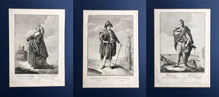 tre incisioni a bulino e acquaforte, 27,5 x 20 cm ca. (cad. lastra), 38 x 26 cm ca. (cad. foglio). Belle, fresche impressioni su carta vergata con filigrana.