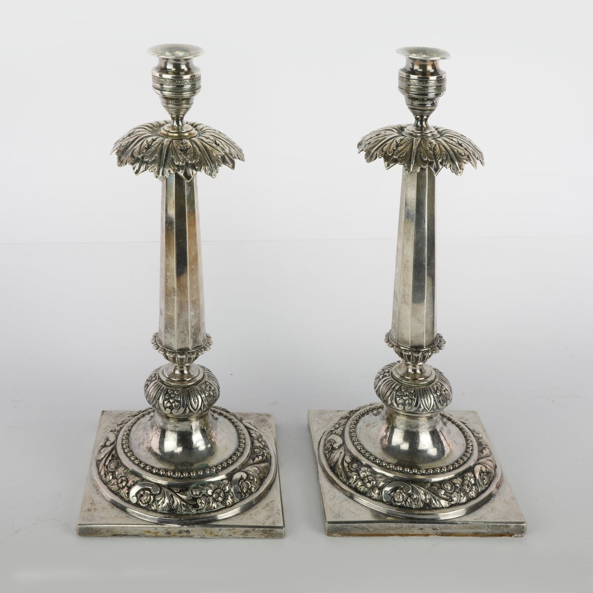 Coppia di candelieri in argento 800/1000 punzoni Torino, prima metà XIX secolo 36 x 15 x 15 cm