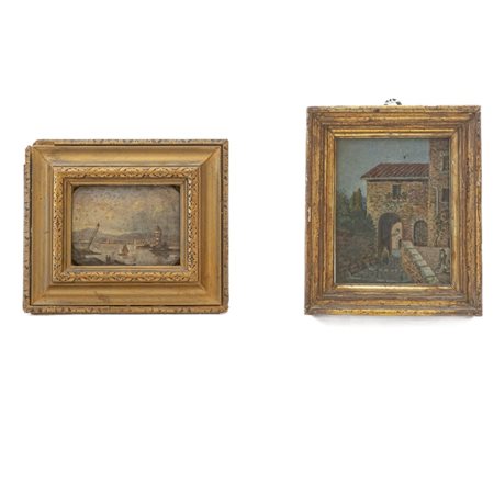 8,5 x 11,5 cm ; 15 x 12 cm scorcio di paese olio su tavola; veduta portuale olio su pietra.
