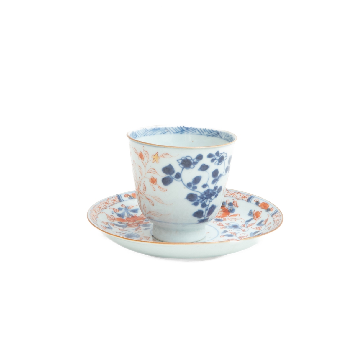 Tazza con piatto in porcellana policroma a decoro Imari, Cina, seconda metà XVIII secolo