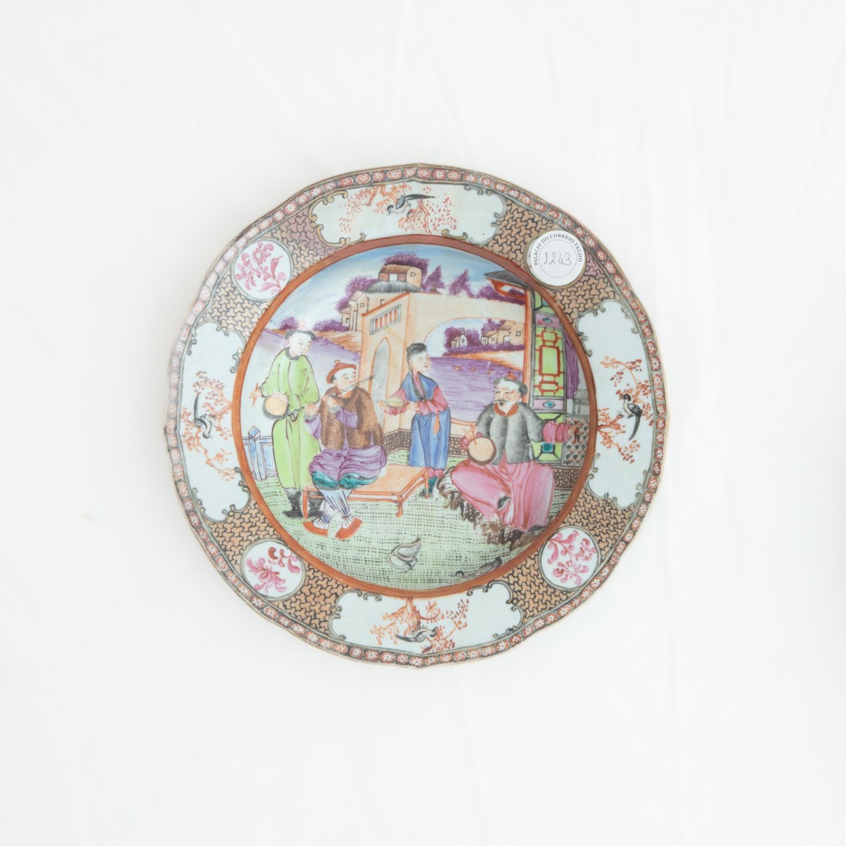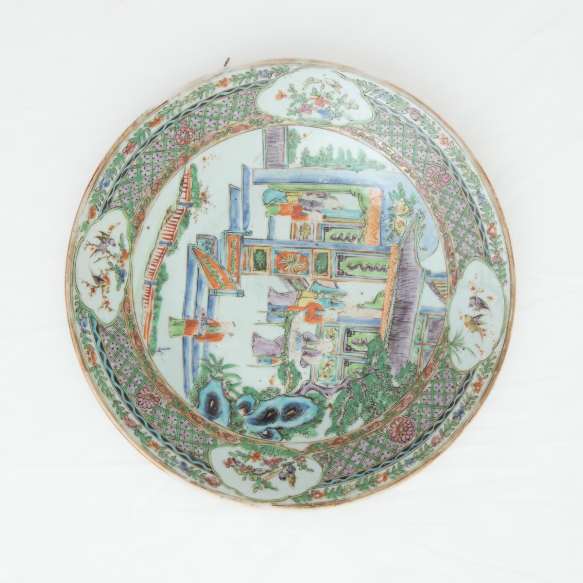 Lotto quattro piatti in porcellana policroma, Cina, XIX secolo