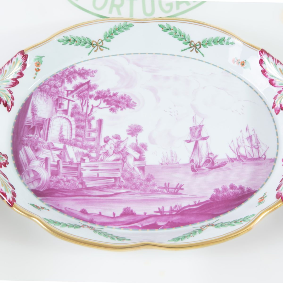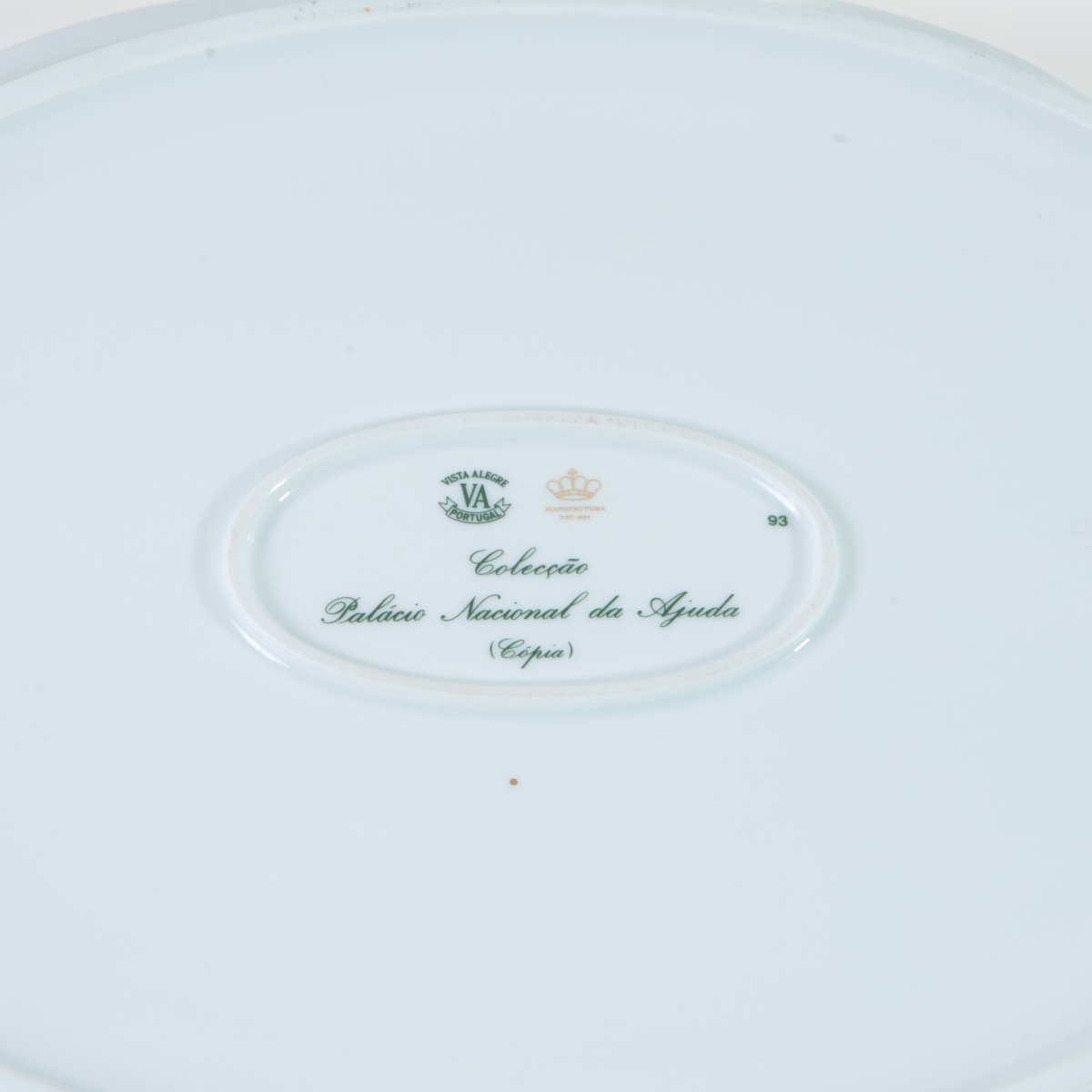 35 x 3,5 x 26 cm di forma ovale con bordo mistilineo e prese a nastro. Sul fondo del piatto decoro con veduta del Palacio National da Ajuda. Manifattura Vista Alegre