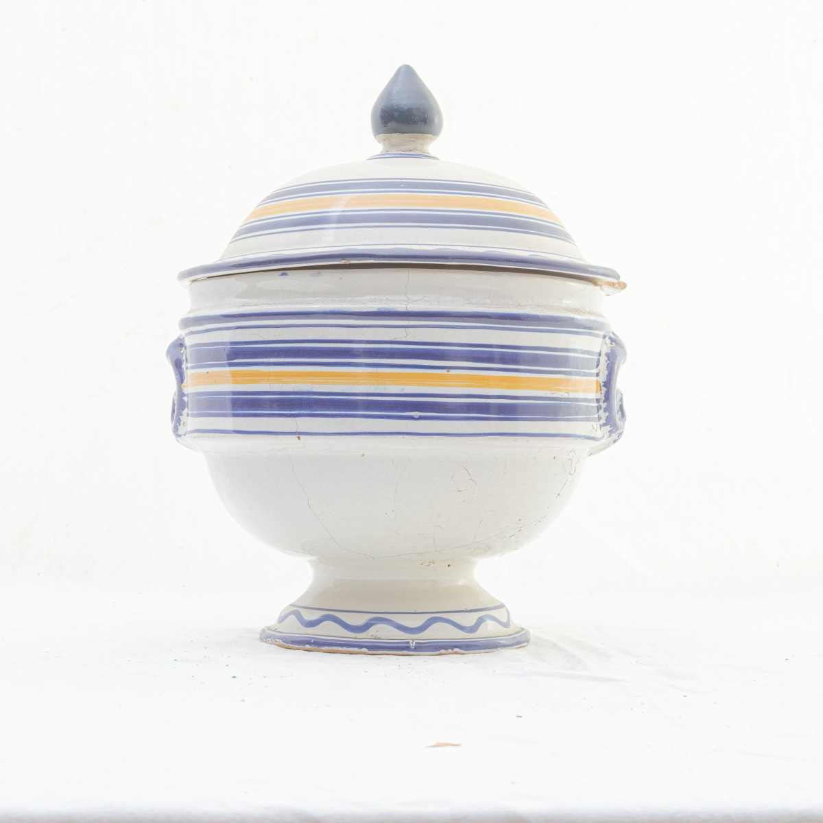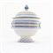 con impugnatura a pomolo su coperchio e prese ad anello. Decoro a strisce blu ed ocra su fondo bianco. Manifattura abruzzese