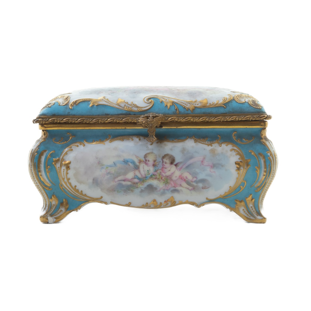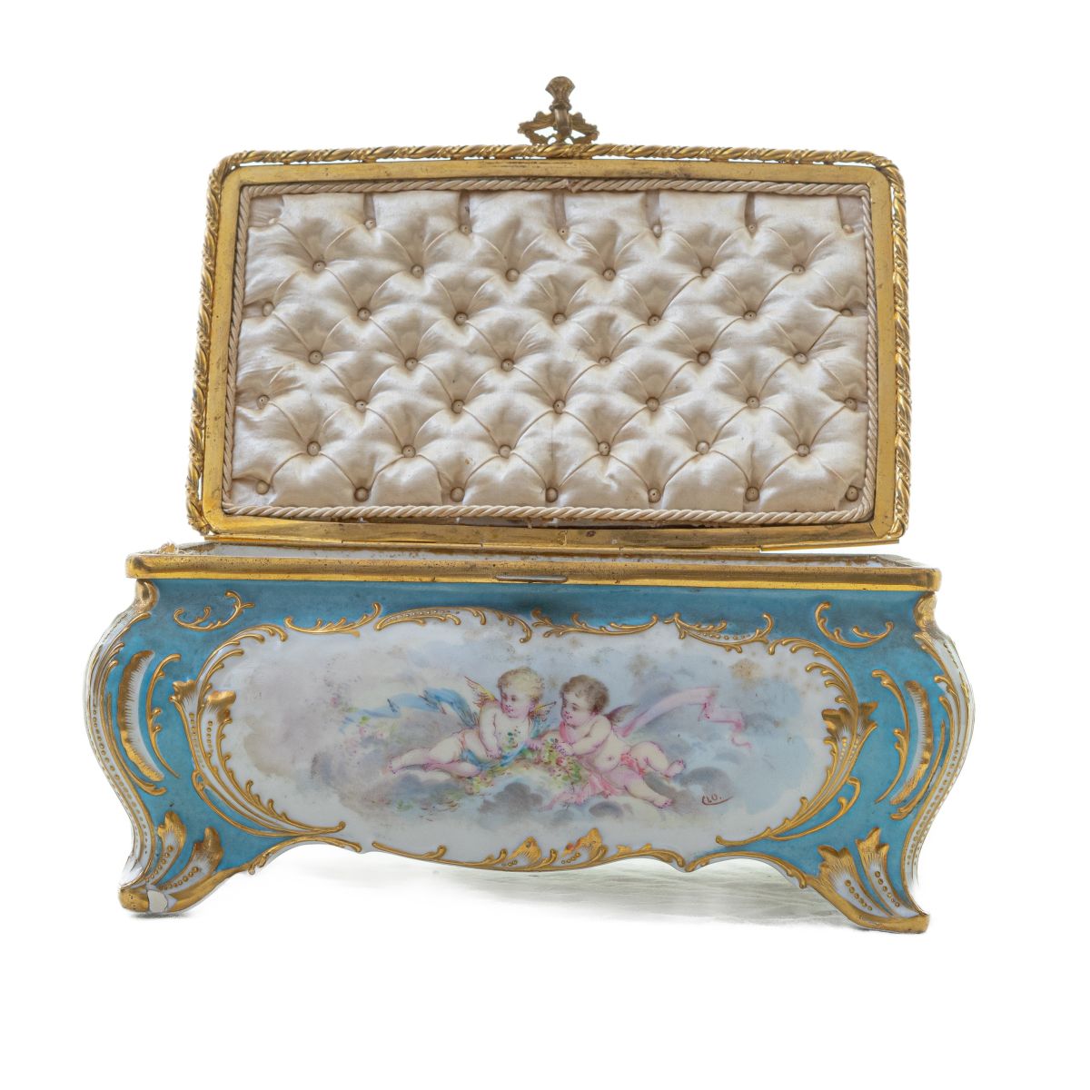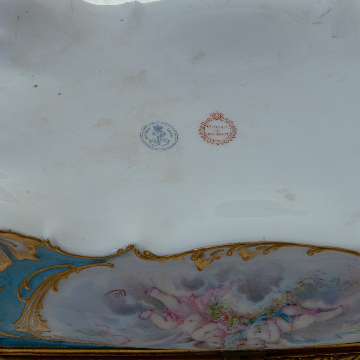 15 x 26 x 16 cm con scene di putti, angeli e paesaggi entro riserve fogliacee e dorate, finiture in bronzo dorato. Francia, manifattura di Sevres , metà XX secolo