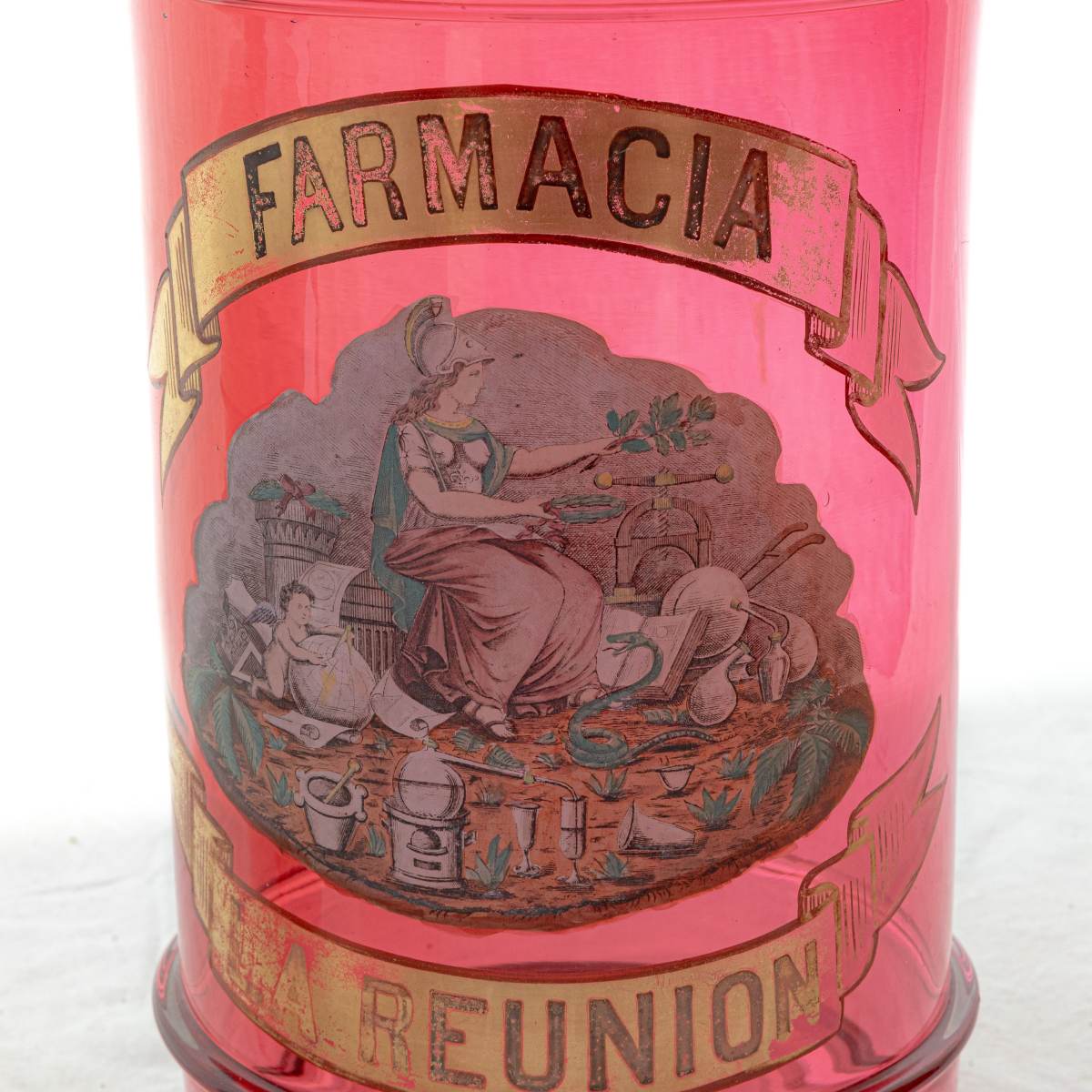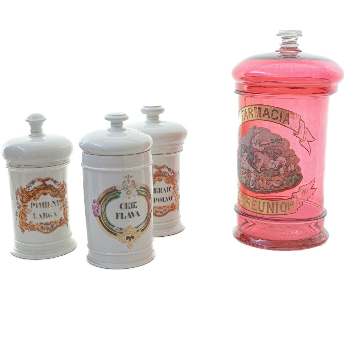 dei quali :uno in vetro rosso con corpo cilindrico e coperchio ad impugnatura a pomello 40 x 18 cm; tre albarelli in porcellana bianca con corpo cilindrico e coperchio ad impugnatura a pomello, 26 x 12 cm. , e decoro entro riserva centrale con il nome dell'essenza e nome della farmacia