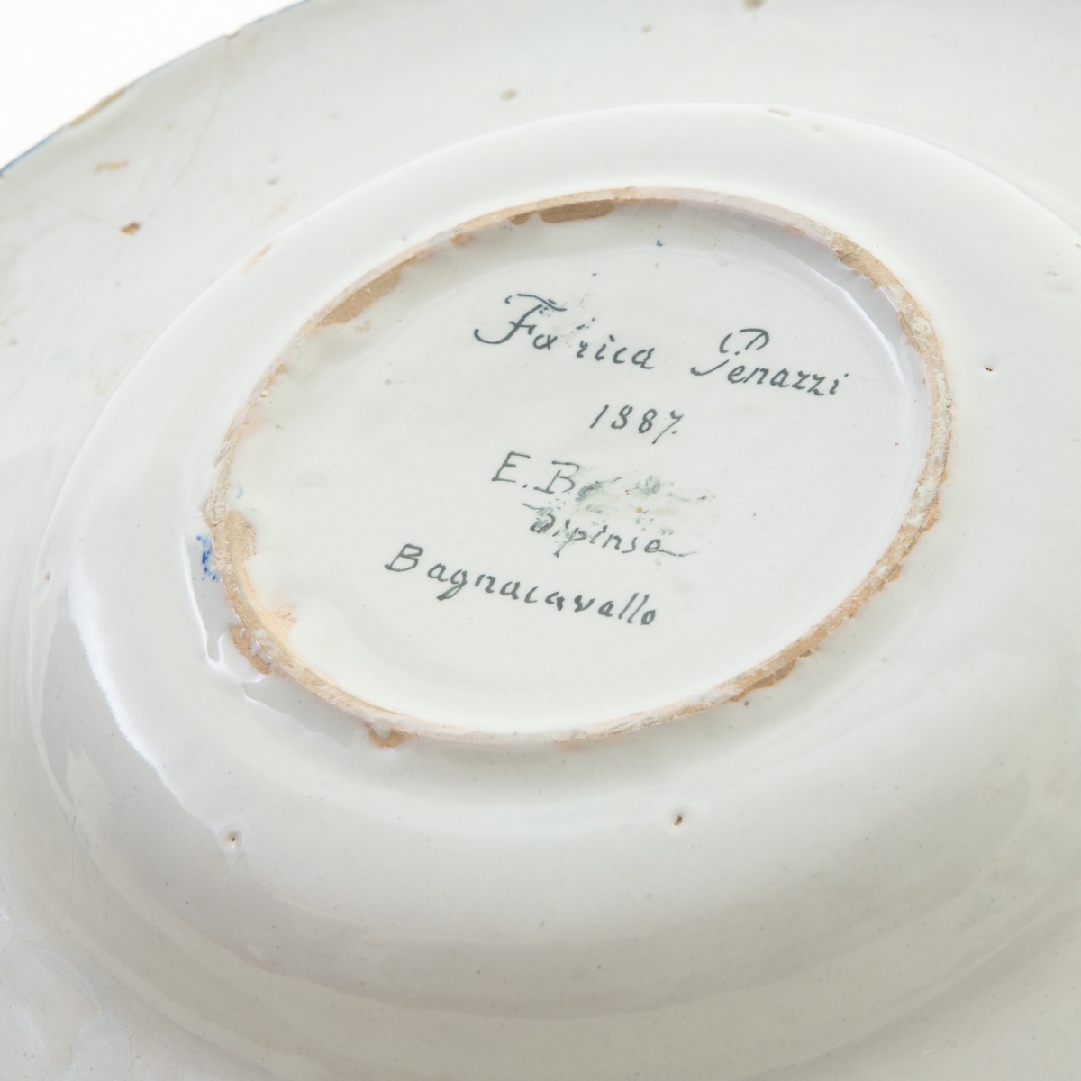 dall'ampia tesa con orlo leggermente ribassato, corta balza, e fondo piano. Decoro sulla balza a girali fitomorfe e figure fantastiche. Al centro del piatto ritratto di giovane fanciulla identificabile con la scritta al retro. Manifattura Penazzi