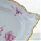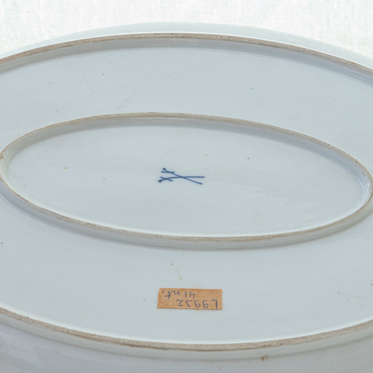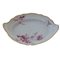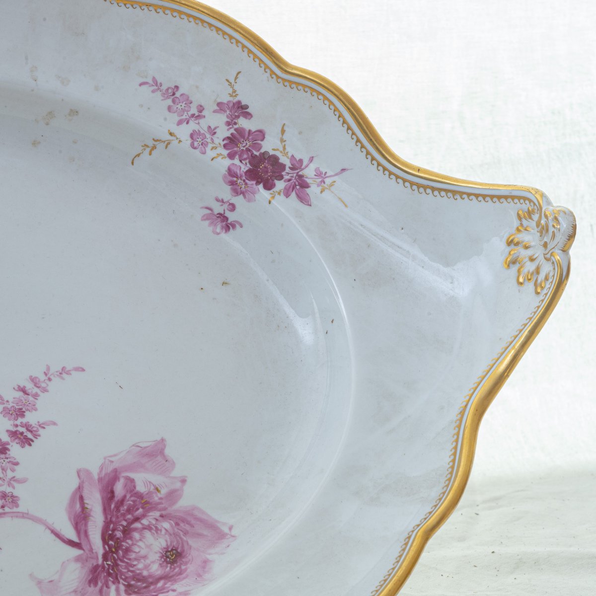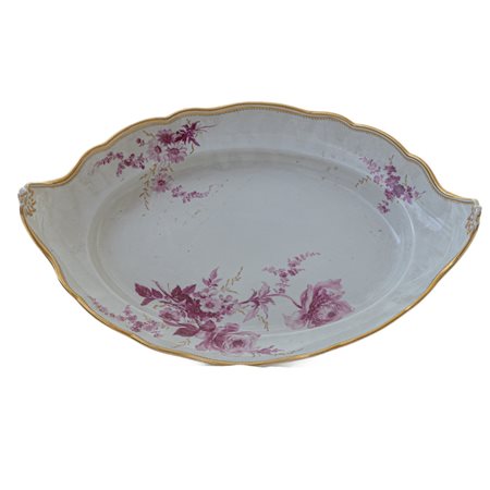 bianca di forma ovale con bordo mistilineo, corta tesa, ripida balza ed ampio fondo, al retro doppio appoggio ad anello. Decoro floreale a porpora di Cassio su fondo bianco e finiture in oro zecchino lungo l'orlo.