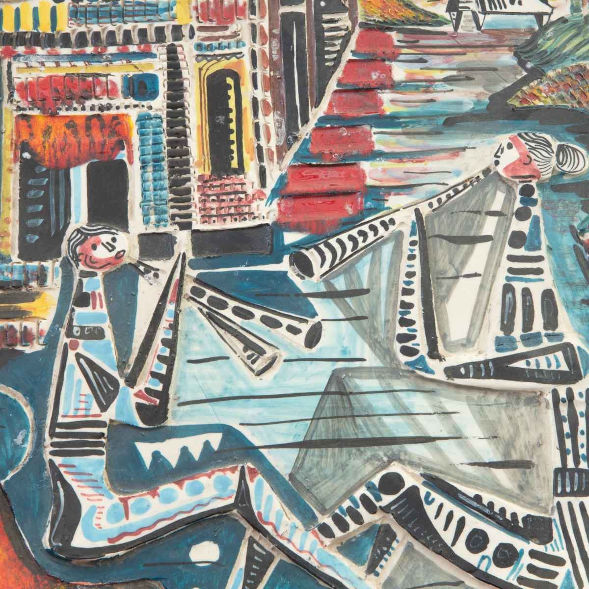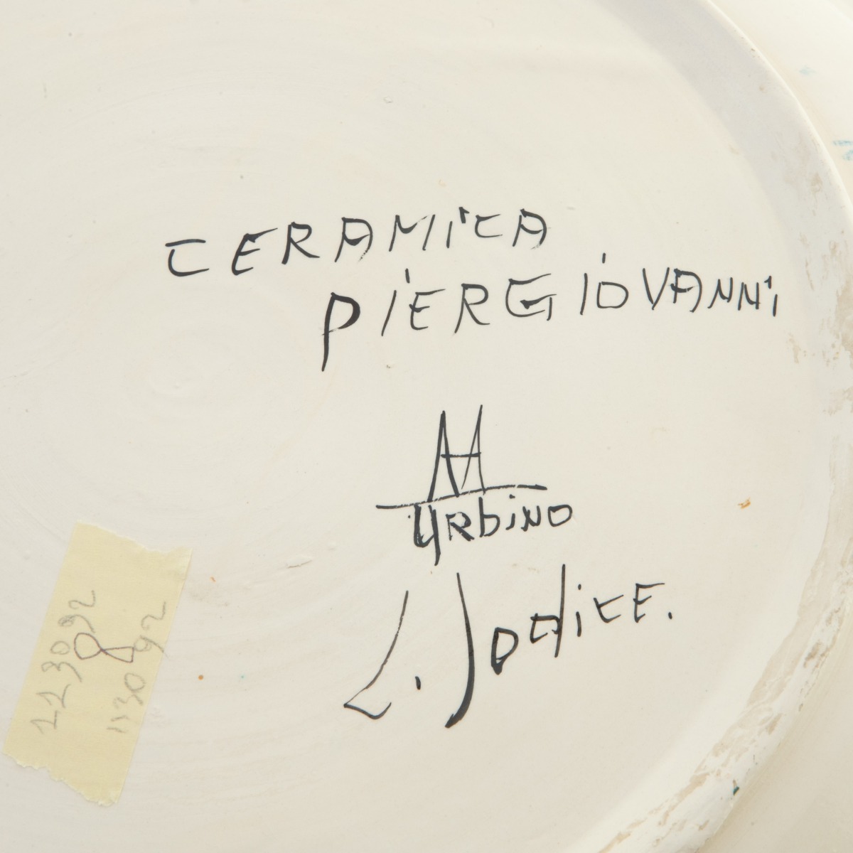diametro 45,5 x 5 cm con elementi a rilievo. Decoro a paesaggio urbano con personaggi e suonatori. Firmato al fronte e al retro
