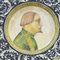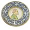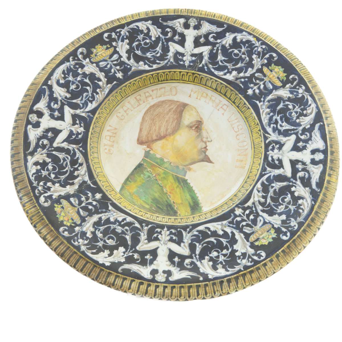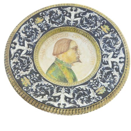 con larga tesa, ripida balza e cavo. Decoro con grottesche e racemi in bianco su fondo blu nella tesa, ritratto di Gian Galeazzo Maria Visconti su fondo bianco nel cavo. Doppia firma manifattura Ceramica Laresina Lodi e al retro, Maria Rumor 1922 nel cavo sotto al ritratto.