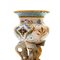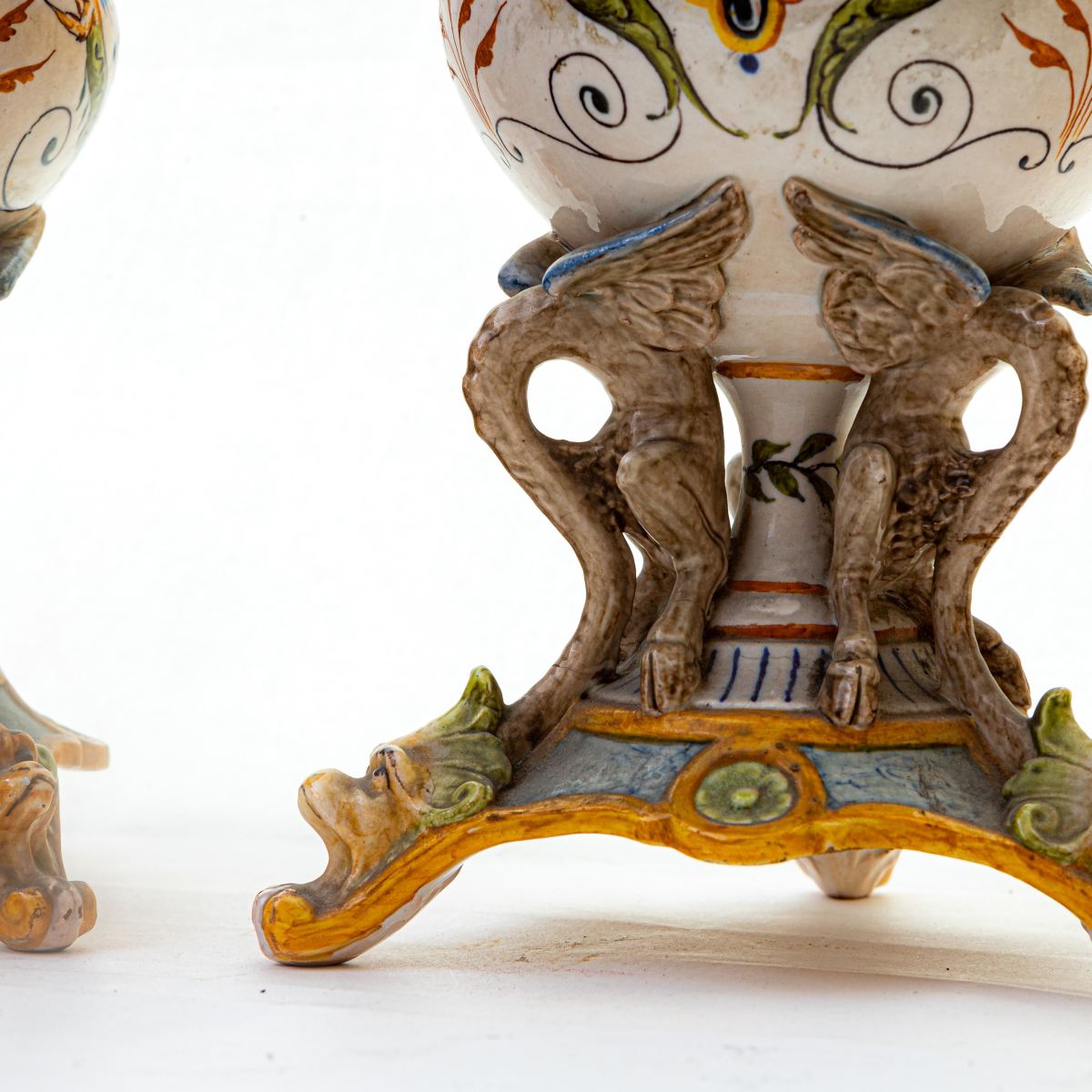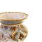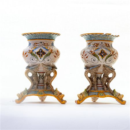 in ceramica policroma a forma di cratere, con base triangolare sostenuta da teste di animali d' invenzione, bordo estroflesso a merletto. Decoro a grottesche su fondo bianco. Manifattura di Ginori Doccia, seconda metà XIX secolo