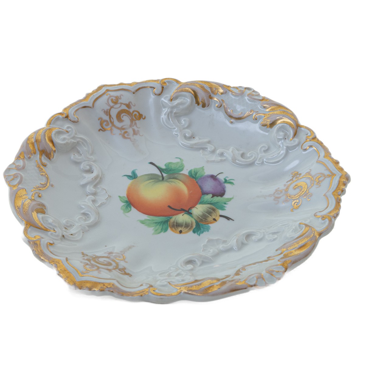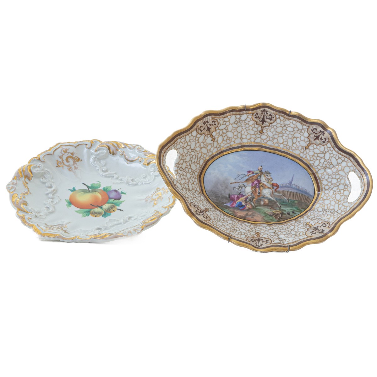 in porcellana policroma forme e dimensioni differenti. Uno con decoro alla frutta , l'altro con scena di lotta tra due armati.