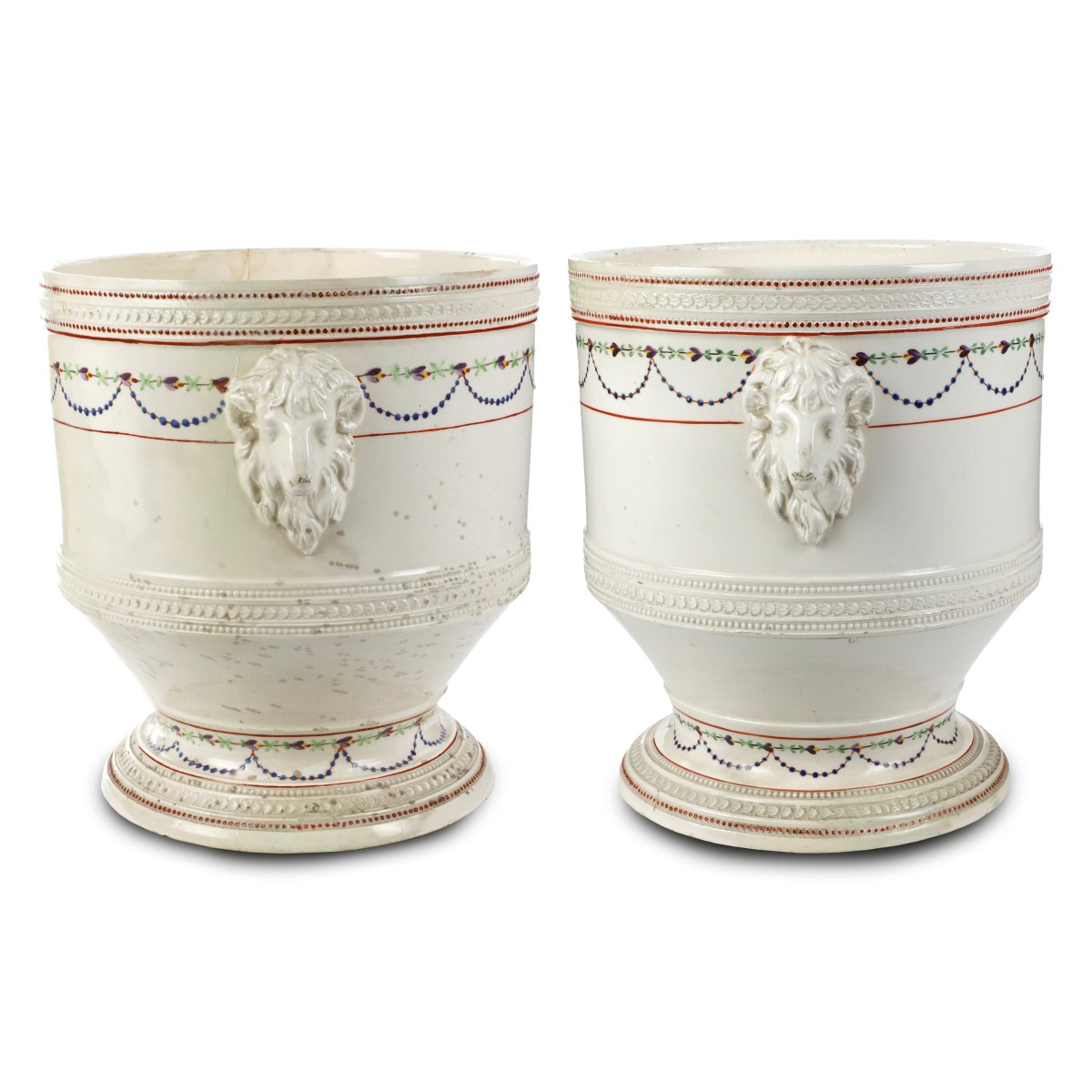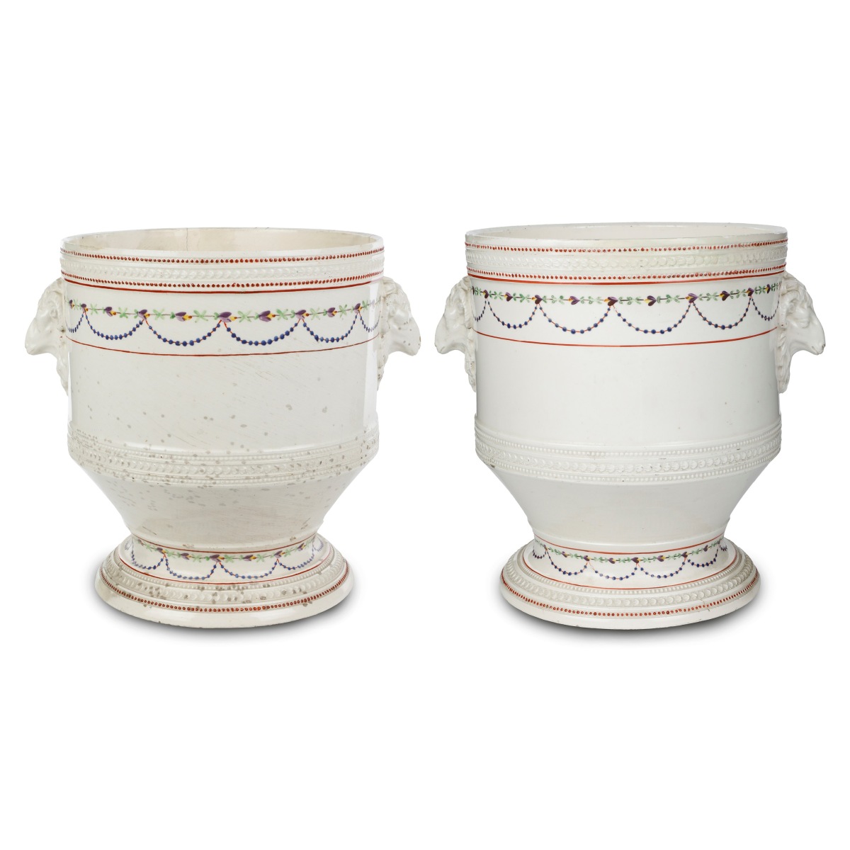 23 x 16 cm Di forma cilindrica, rastremati verso il basso con piede di appoggio ad anello a fondo ribassato. Anse a forma di testa di montone. Sul bordo superiore del corpo e sulla parte inferiore cintura ad elementi floreali ricorrenti e perline. Decorazioni a festoni floreali e perline nelle cromie rosso, violetto, verde e blu.