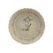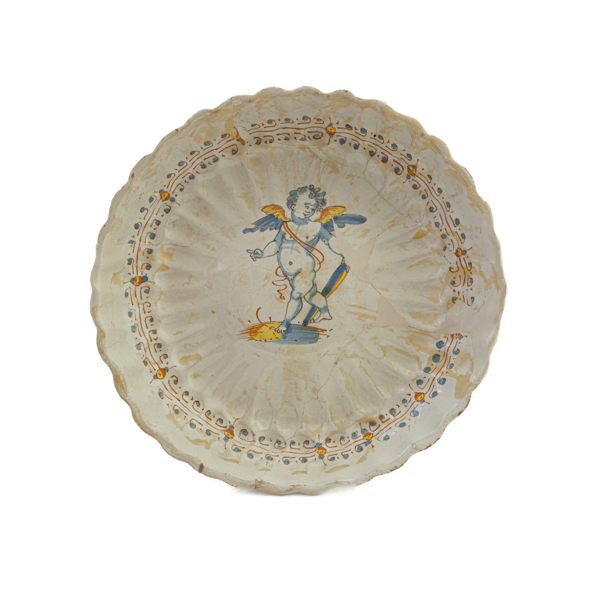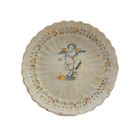 bordo mistilineo con baccellature che partendo dall'orlo arrivano al centro del piatto. Parte centrale rialzata dal corpo ceramico e piede d'appoggio ad anello su corto collo. Decoro a putto alato nelle cromie blu, giallo e arancio su fondo bianco con cintura stilizzata floreale tra l'alzata dell'orlo e la base del piatto.