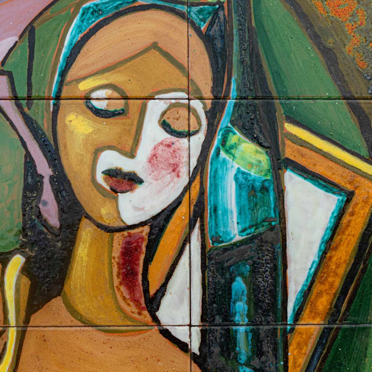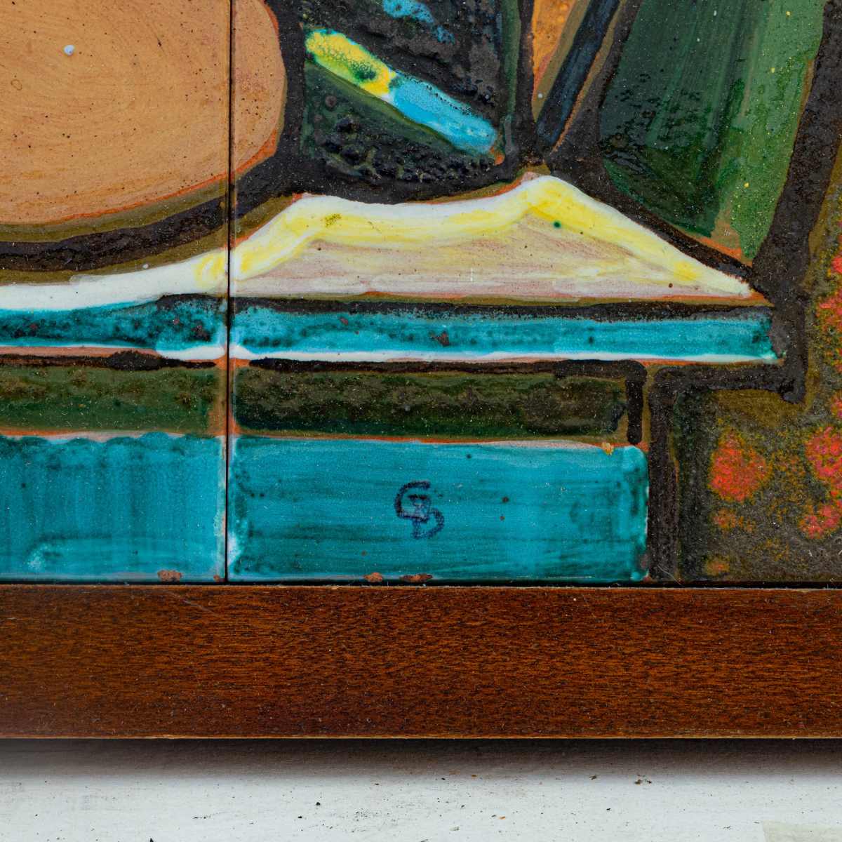 composizione in ceramica policroma smaltata composta da dodici mattonelle 20 x 20 cm per un sviluppo totale 60 x 80 cm. Siglata al fronte in basso a destra