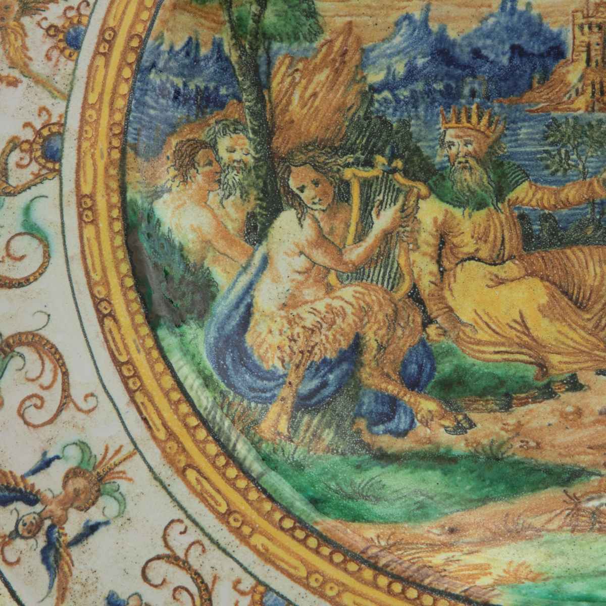diametro 41 x 4,5 cm dalla larga tesa, corta balza e d ampio fondo. Retro con appoggio ad anello. Decoro sulla tesa ad arpie ed animali fantastici su fondo avorio. Nel cavo scena tratta dall'antico, probabilmente Re Mida, entro paesaggio con personaggi, satiri e costruzioni. Produzione area metaurense con traccia di iscrizione in manganese sotto smalto al retro.