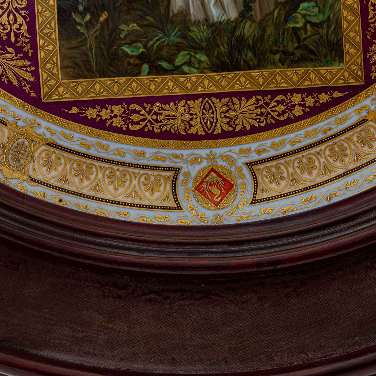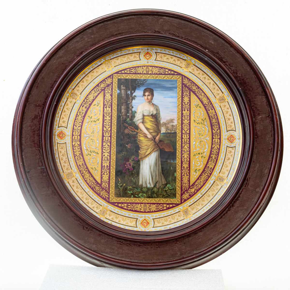 diametro 49 cm piatto in porcellana policroma, ripresa da una celebre tela di August von Kaulbach entro cornice in legno. Manifattura di Vienna, fine XIX inizio XX secolo. Piatto firmato sotto smalto al verso e al tergo con iscrizione e dedica.