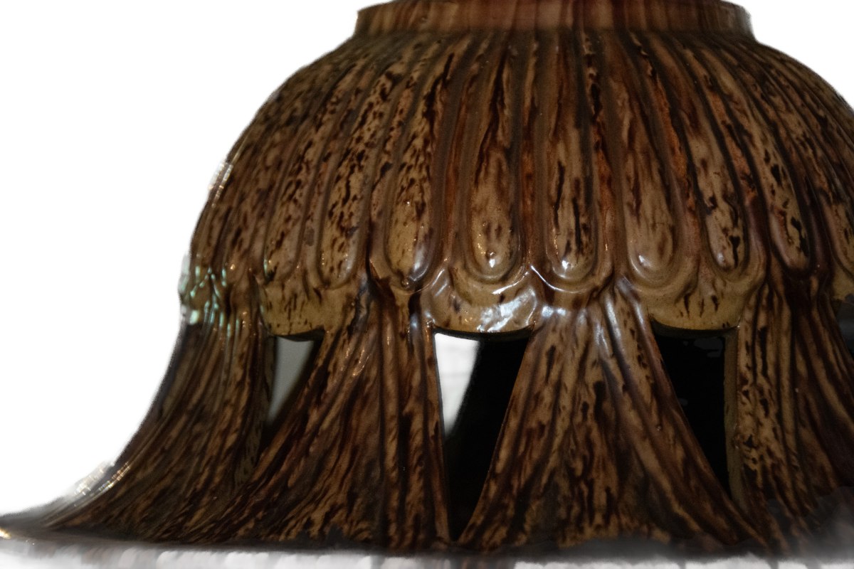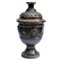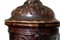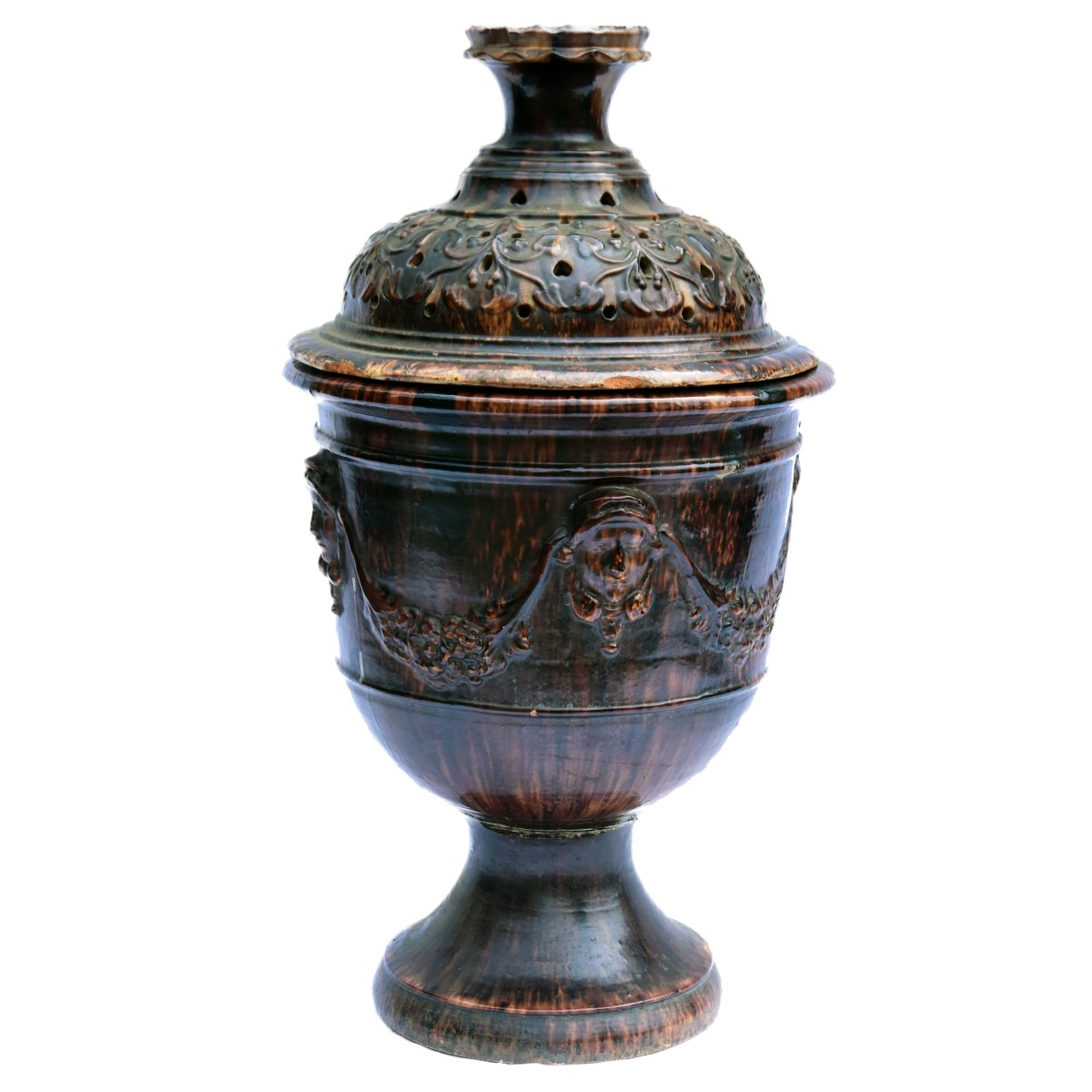 90 x 45 cm di forma cilindrica con coperchio traforato, smaltate in marrone fumè, lungo il corpo del vaso festone e maschere.