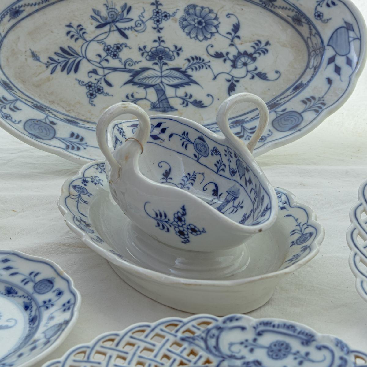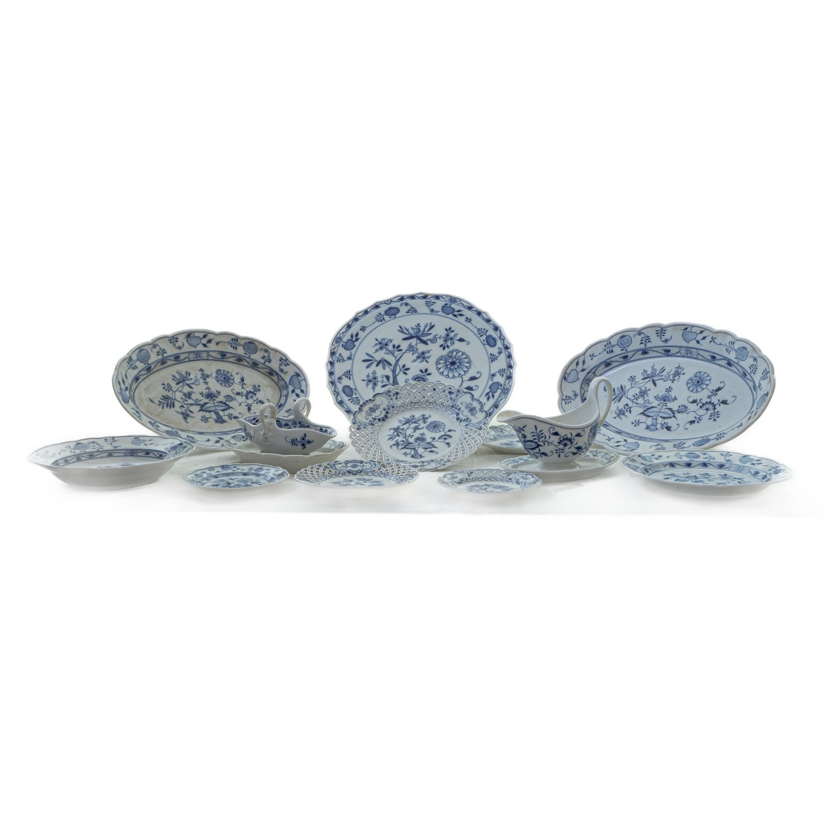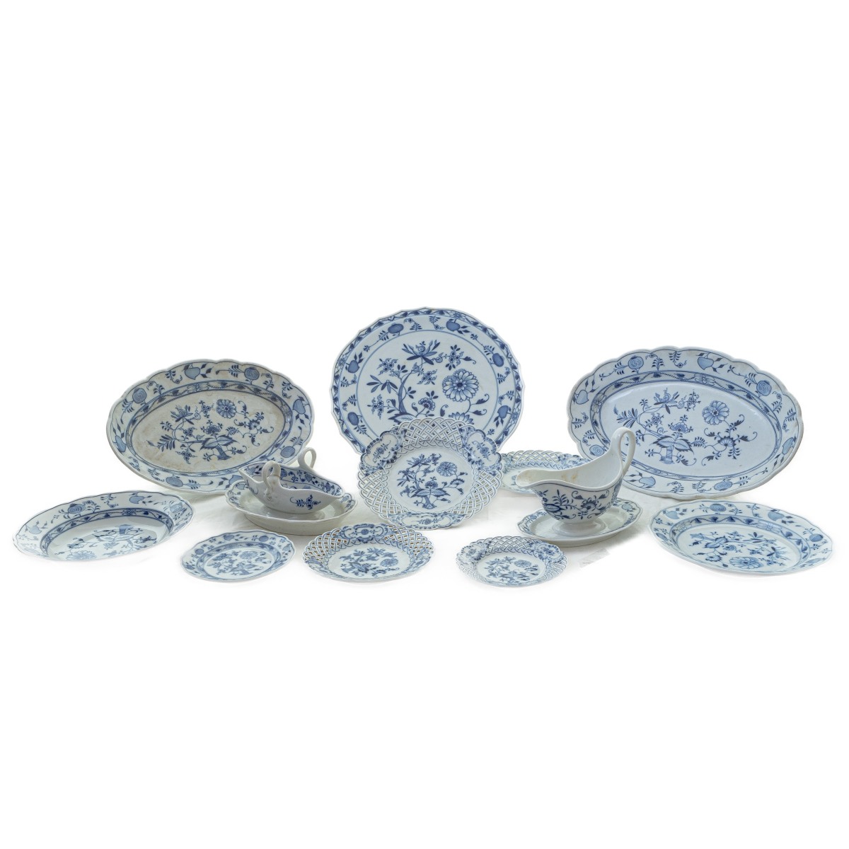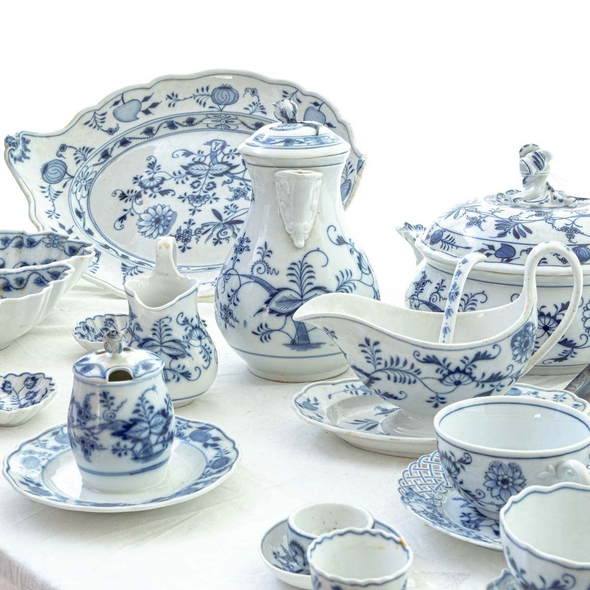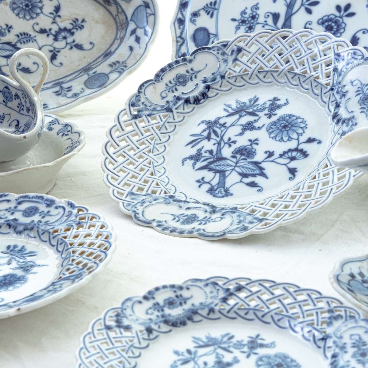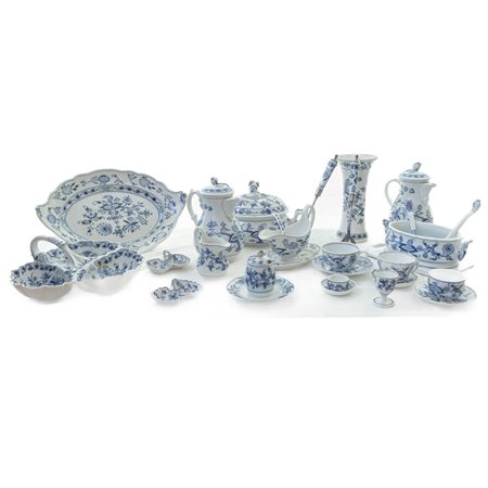 con decoro a fiori blu su fondo bianco composto da: Servito da dolce con 3 vassoi tondi traforati, 2 cestini ovali traforati de quali uno con prese ad anse , 1 vassoio a barca con decoro a fiori a rilievo e prese a ramoscello, 42 piatti piani traforati in cinque misure differenti, 2 alzate traforate, 3 cestini tondi traforati pezzi 53. Servito da pasto con 51 piatti da coltello diametro 24 x 3,2 cm , 23 scodelle fonde diametro 25 x 5 cm, 45 piatti da dessert in quattro misure diametro 16; 18; 19,5 ;21 cm , 8 vassoi grandi ovali, 5 vassoi medi ovali, 4 vassoi ovali mignon, 6 salsiere a doppia presa di cui una rotta, 2 salsiere con presa ad orecchio, 3 vasi a tromba a due misure, 1 antipastiera tonda divisa a metà, 3 vassoi grandi in due misure, 4 insalatiere quadrangolari in tre diverse grandezze, 1 zuppiera , 1 tagliere, 6 vassoi a mezzaluna, 1 antipastiera grande triangolare, 4 saliere tonde di due diverse grandezze a due vasche, 2 mostardiere a barilotto, pezzi 170. Servito da caffe/te composto da : 2 caffettiere, 5 lattiere a tre misure diverse, 1 burriera , 1 teiera, 12 tazze da te tonde con orlo liscio ed ansa ad orecchio, 11 tazze da caffè corpo a campana, bordo mistilineo , presa a rami intrecciati, 11 piatti da tazza con orlo mistilineo, 6 piatti da tazza con orlo liscio, 2 saliere a forma di foglia con corpo a conchiglia, 1 zuccheriera , pezzi 52. Lotto di 22 accessori da servizio parti scompagnate. Totale pezzi 297. Manifattura di Meissen