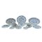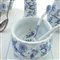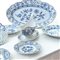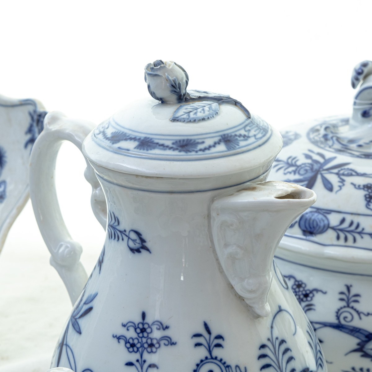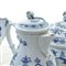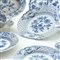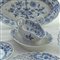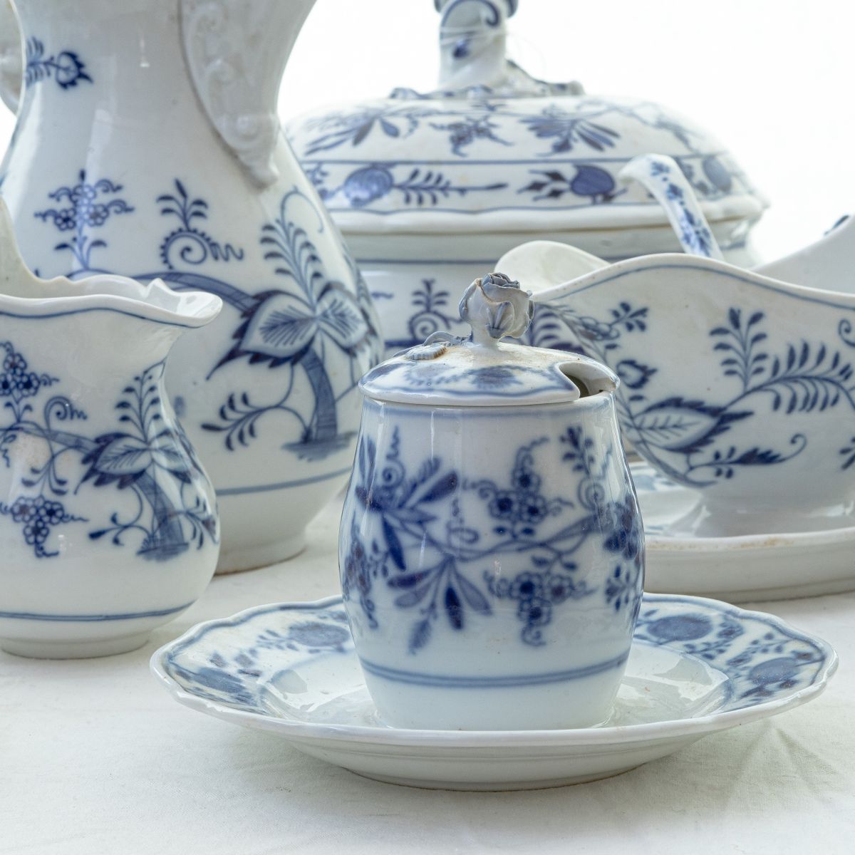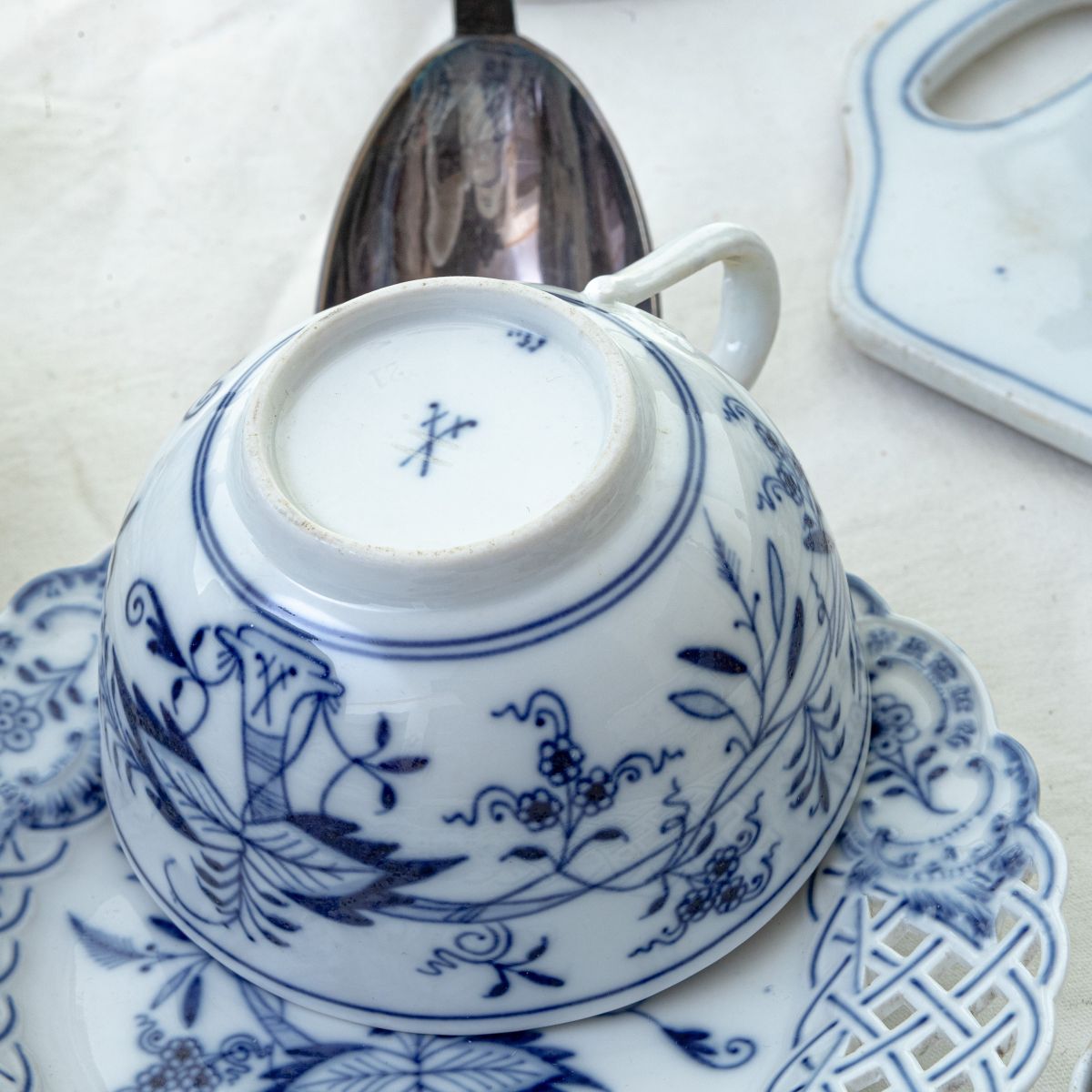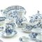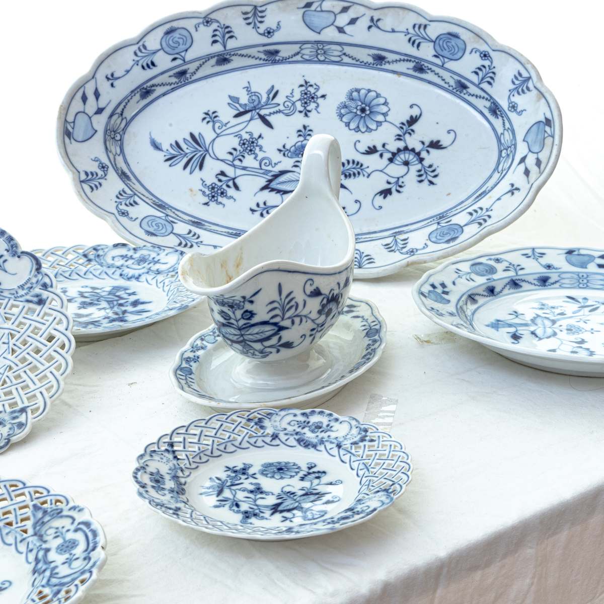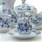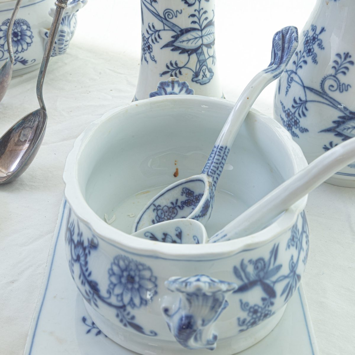 con decoro a fiori blu su fondo bianco composto da: Servito da dolce con 3 vassoi tondi traforati, 2 cestini ovali traforati de quali uno con prese ad anse , 1 vassoio a barca con decoro a fiori a rilievo e prese a ramoscello, 42 piatti piani traforati in cinque misure differenti, 2 alzate traforate, 3 cestini tondi traforati pezzi 53. Servito da pasto con 51 piatti da coltello diametro 24 x 3,2 cm , 23 scodelle fonde diametro 25 x 5 cm, 45 piatti da dessert in quattro misure diametro 16; 18; 19,5 ;21 cm , 8 vassoi grandi ovali, 5 vassoi medi ovali, 4 vassoi ovali mignon, 6 salsiere a doppia presa di cui una rotta, 2 salsiere con presa ad orecchio, 3 vasi a tromba a due misure, 1 antipastiera tonda divisa a metà, 3 vassoi grandi in due misure, 4 insalatiere quadrangolari in tre diverse grandezze, 1 zuppiera , 1 tagliere, 6 vassoi a mezzaluna, 1 antipastiera grande triangolare, 4 saliere tonde di due diverse grandezze a due vasche, 2 mostardiere a barilotto, pezzi 170. Servito da caffe/te composto da : 2 caffettiere, 5 lattiere a tre misure diverse, 1 burriera , 1 teiera, 12 tazze da te tonde con orlo liscio ed ansa ad orecchio, 11 tazze da caffè corpo a campana, bordo mistilineo , presa a rami intrecciati, 11 piatti da tazza con orlo mistilineo, 6 piatti da tazza con orlo liscio, 2 saliere a forma di foglia con corpo a conchiglia, 1 zuccheriera , pezzi 52. Lotto di 22 accessori da servizio parti scompagnate. Totale pezzi 297. Manifattura di Meissen
