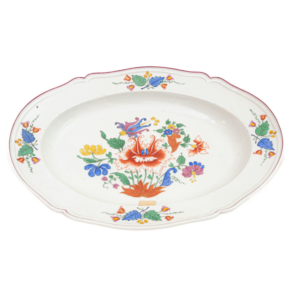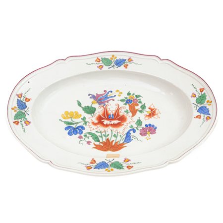 di forma ovale a quattro punte, con orlo rialzato leggermente estroflesso, stretta tesa su corta balza desinente in ampio fondo. Al retro appoggio a fondo ribassato che definisce un anello. Decoro al " tulipano" con elementi fogliati e fiori recisi su fondo bianco. Finiture in oro zecchino. Foggiato a stampo.