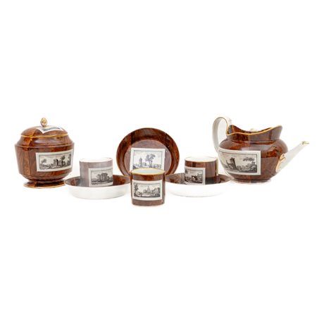 composto da: teiera, zuccheriera e tre tazze con piatto. Teiera a palla con presa a nastro e versatoio a canna e dal fondo ribassato. Decoro a paesaggi entro riserve bianche su fondo a tappezzeria marrone. Tazze en suite a cilindro con prese rettangolari e piatti en suite dall'alto bordo e dal fondo ribassato. Zuccheriera en suite di forma cilindrica rastremata verso il basso con coperchio. Tutti i pezzi sono marcati in blu sotto smalto.
