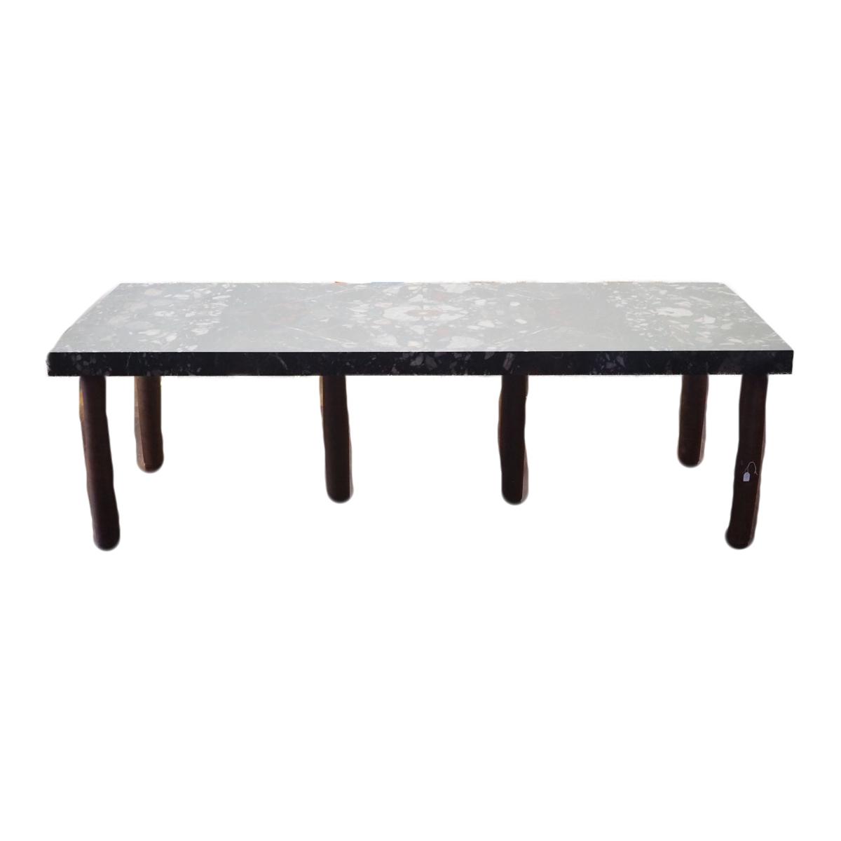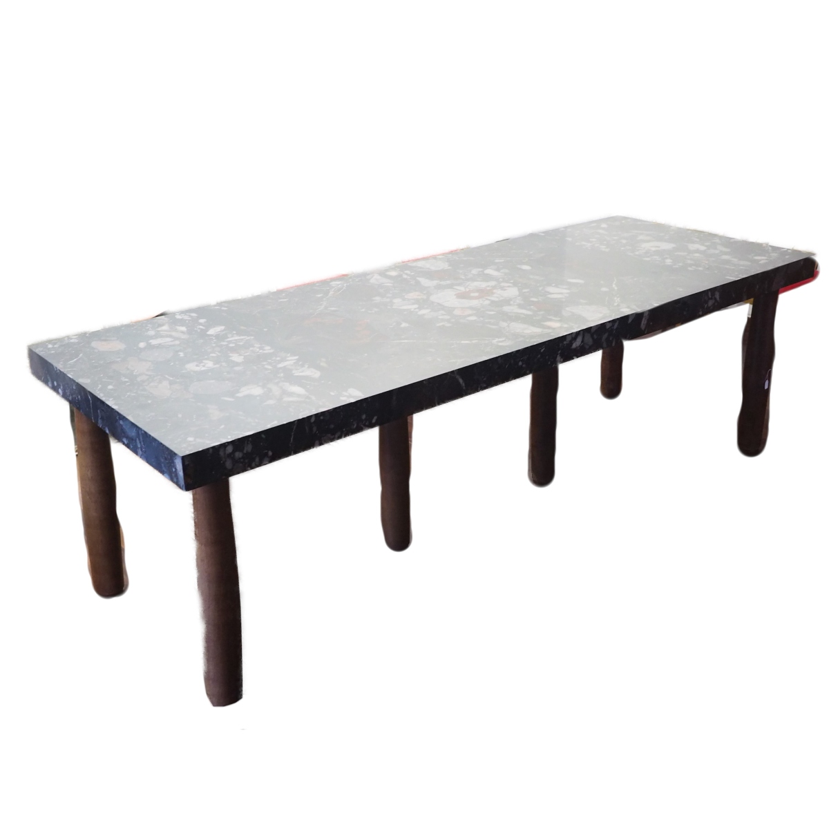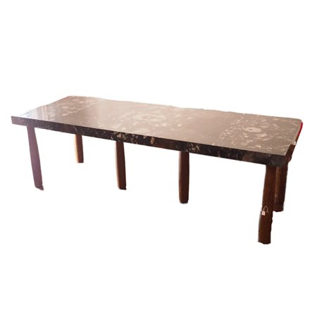 250 x 90 cm in legno, con piamo in marmo breccia delle Alpi. Opera ubicata presso la dimora romana dell'affidante.