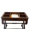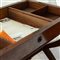 75 x 82 x 48 cm con gambe incrociate raccordate alla base e piano a compasso con sottostante cassetto a scomparti.