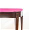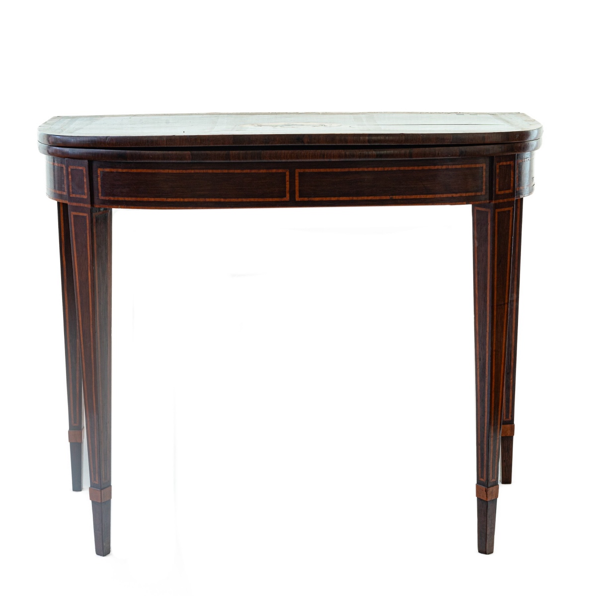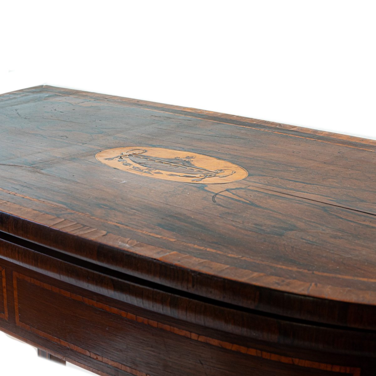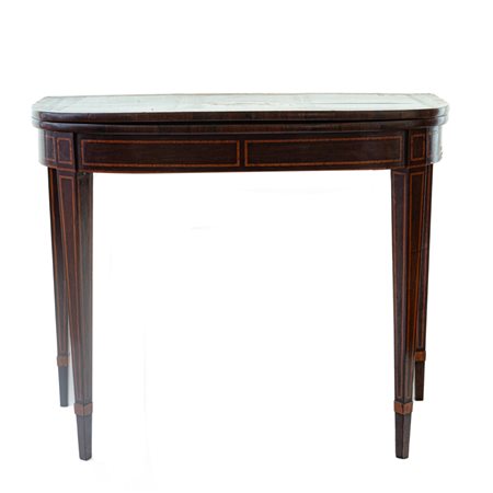chiuso 76 x 92 x 42 cm; aperto 74 x 92 x 89 cm di forma rettangolare ad angoli stondati, con quattro gambe troncoconiche rastremate verso il basso. Piano in panno rosso, elementi decorativi rettangolari con filettature in legno di frutto.