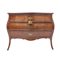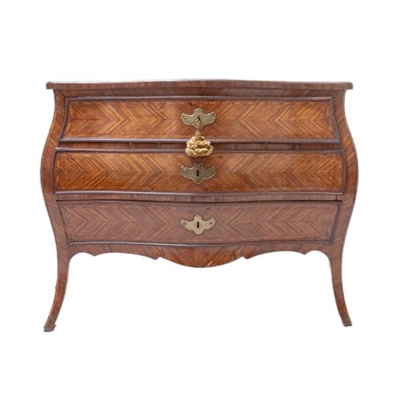 impiallacciato in mogano spinato, di forma bombata sul fronte e sui fianchi. Quattro gambe a virgola, riquadrature a tarsia sui fianchi e sul piano, cassetti incorniciati a rilievo.