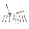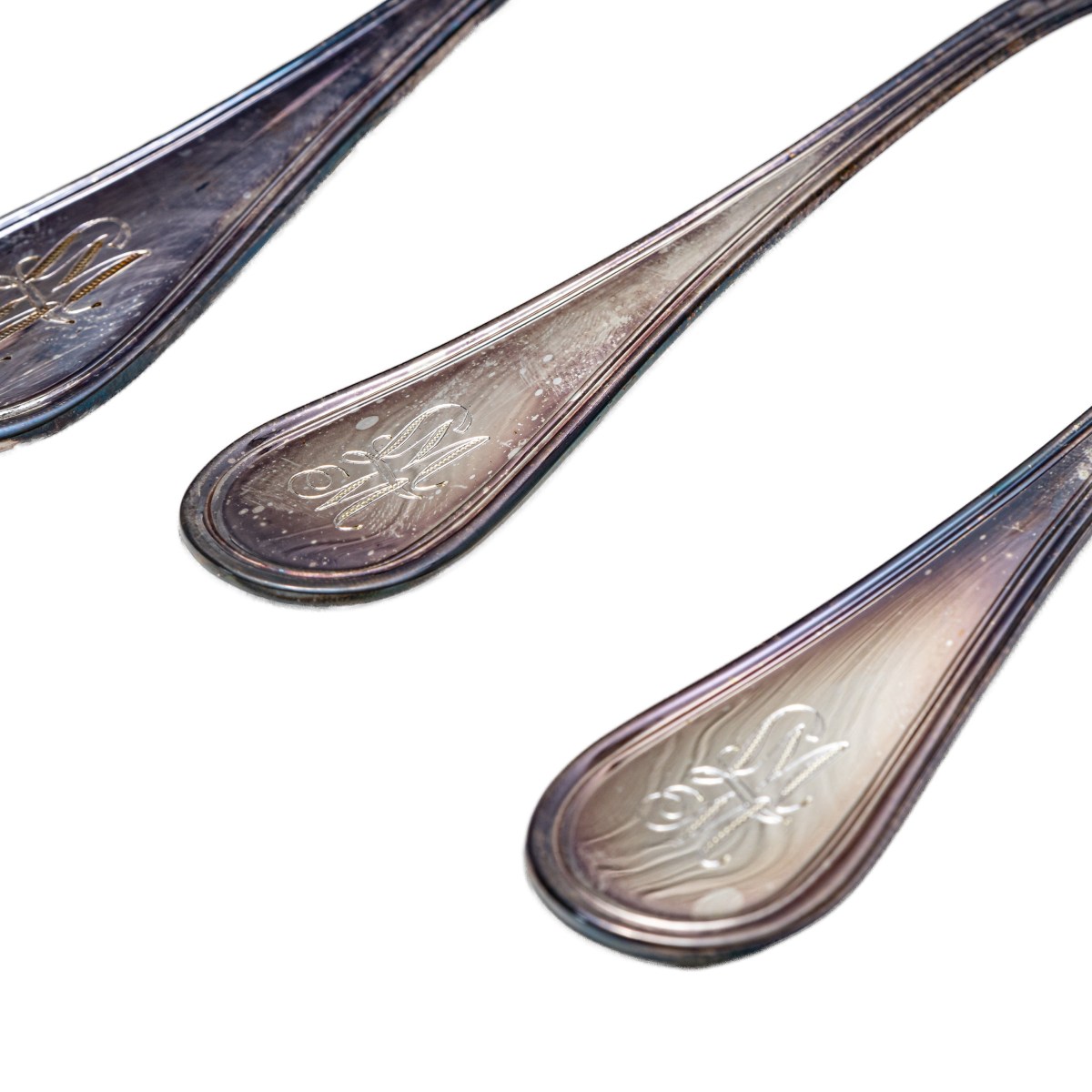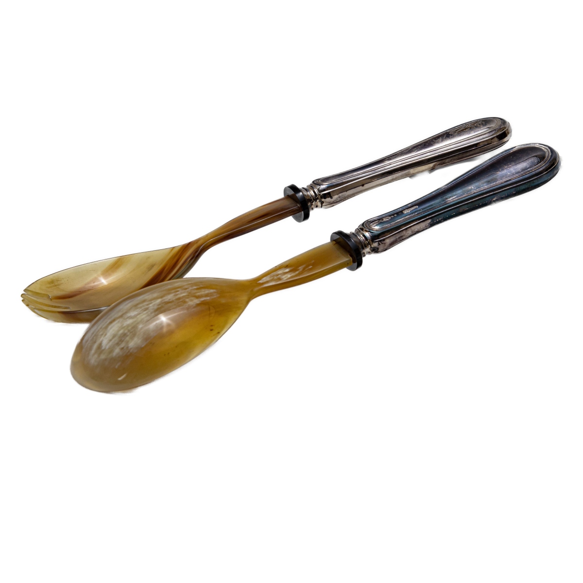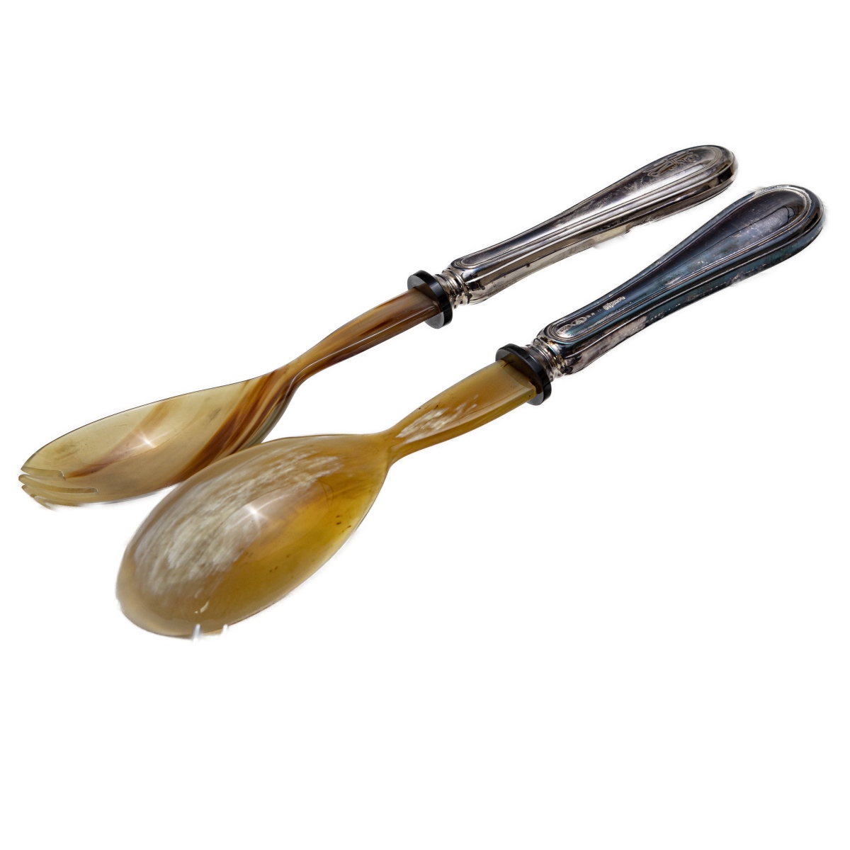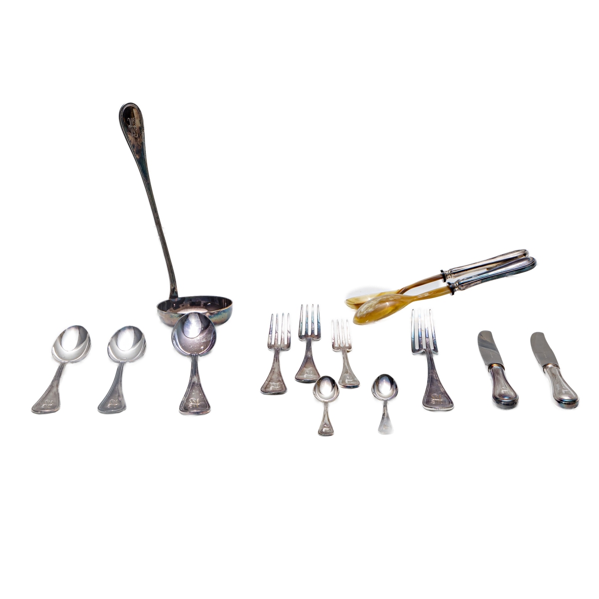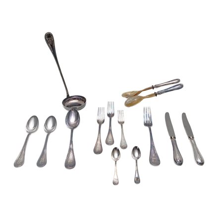 composto da: 48 forchette a due misure, 12 cucchiaini, tre posate da servizio , 24 coltelli grandi, 24 coltelli piccoli en suite con le forchette e coppia di posate in corno e argento gr. 4.314 peso lordo gr. 9.507