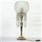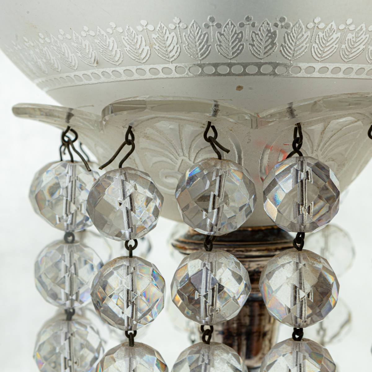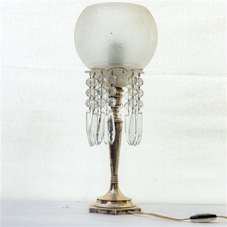 con corpo tornito in argento 800/1000 e base esagonale. Parte terminale a rosa con pendenti e boccia in vetro bianco lavorato all'acido a motivi floreali.