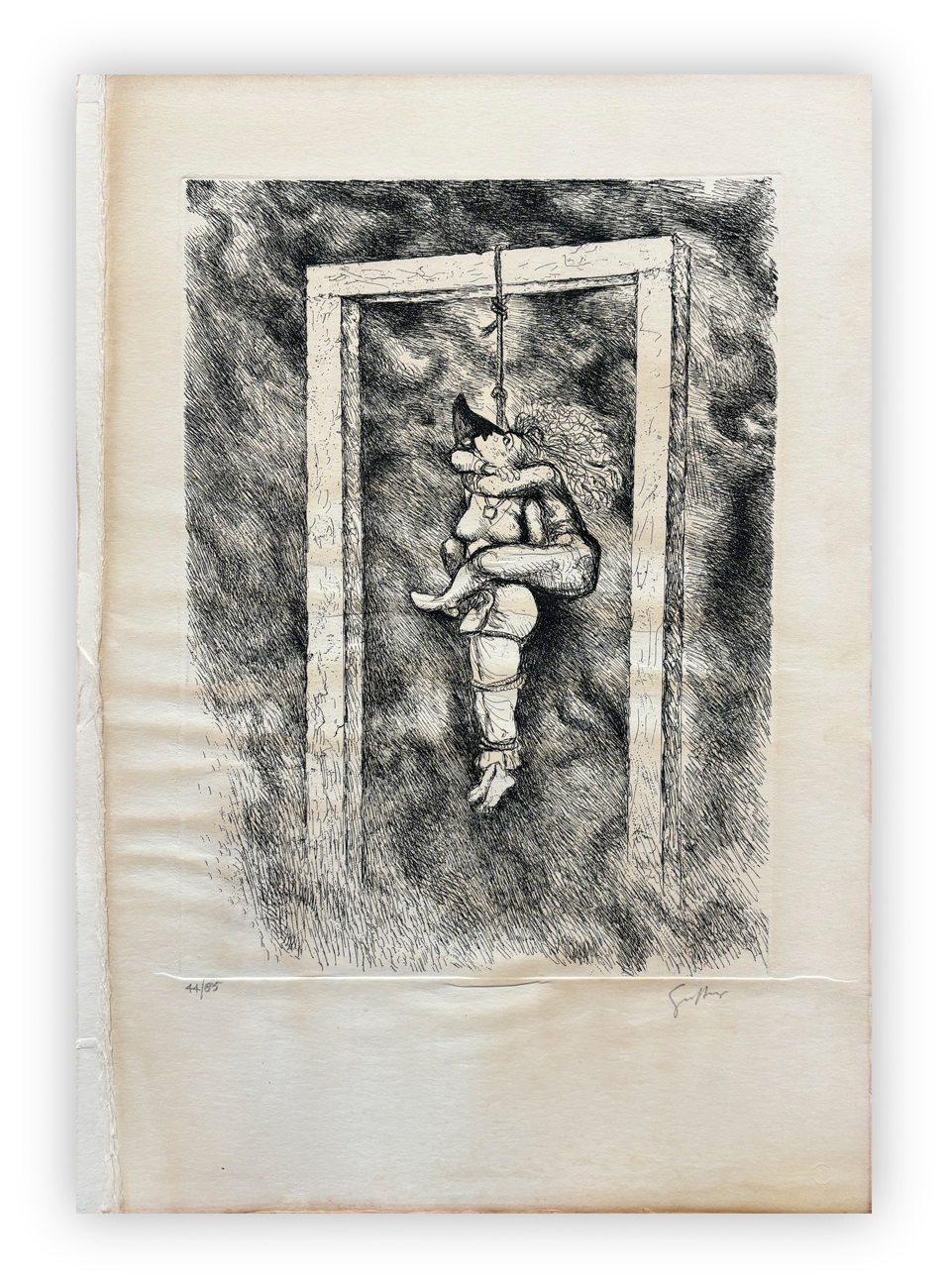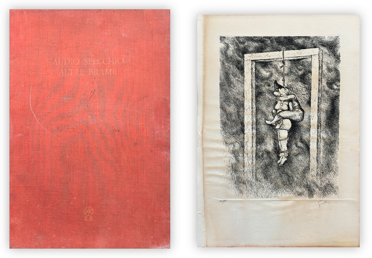 Rara edizione d'arte contenente racconto di Leonardo Sciascia illustrato da un'acquaforte in bianco e nero di Renato Guttuso recante firma e numerazione (Esemplare 44/85) a matita al fronte