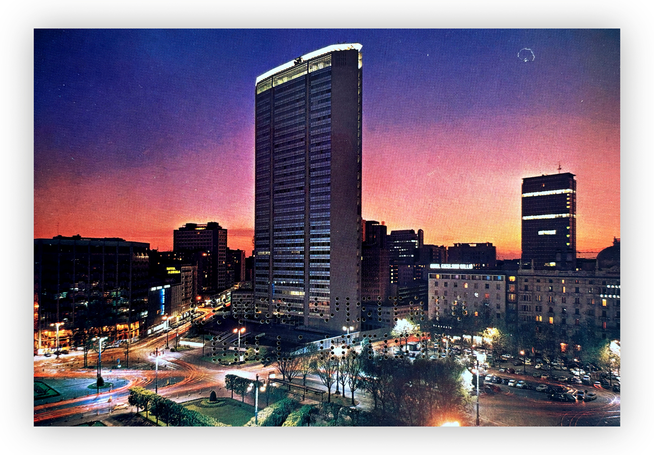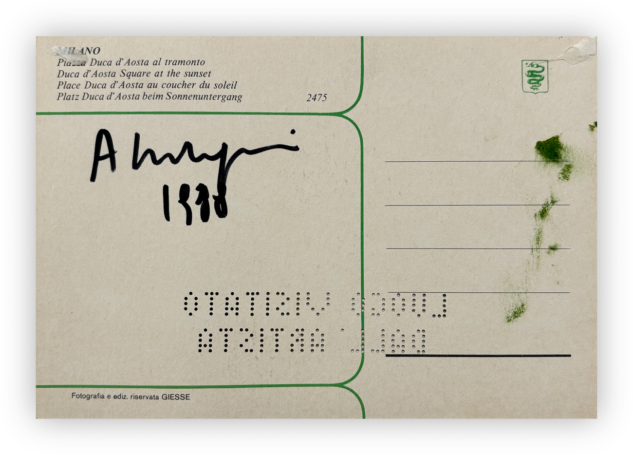 Cartolina postale di Milano con scritta forata a punzone 'Luogo visitato dall'artista'